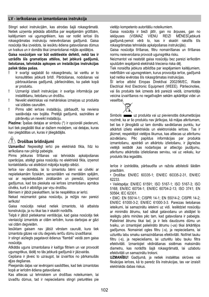 - EMC: EN 55014-1; CISPR 14-1; EN 55014-2; CISPR 14-2; EN/IEC 61000-3-2; EN/IEC 61000-3-3. Pareizas lietošanas ieteikumi, lai samazinātu ietekmi uz vidi. Ieslēdziet nosūcēju ar minimālo ātrumu, kad sākat gatavošanu un atstājiet to ieslēgtu pāris minūtes pēc tam, kad gatavošana ir pabeigta. Palieliniet ātrumu tikai tad, ja ir liels daudzums dūmu un tvaiku, un izmantojiet palielināto ātrumu (-us) tikai ārkārtējos gadījumos. Nomainiet ogles filtru (-s), ja nepieciešams, lai uzturētu labu smaku samazināšanas efektivitāti. Notīriet tauku filtru (-s), ja nepieciešams, lai uzturētu labu tauku filtra efektivitāti. Izmantojiet vēdināšanas sistēmas maksimālo diametru, kas norādīts šajā rokasgrāmatā, lai uzlabotu efektivitāti un samazinātu troksni. UZMANĪBU! Gadījumā, ja netiek instalētas skrūves vai fiksācijas ierīces, kā to paredz šīs instrukcijas, tas var izraisīt elektriskās dabas riskus.