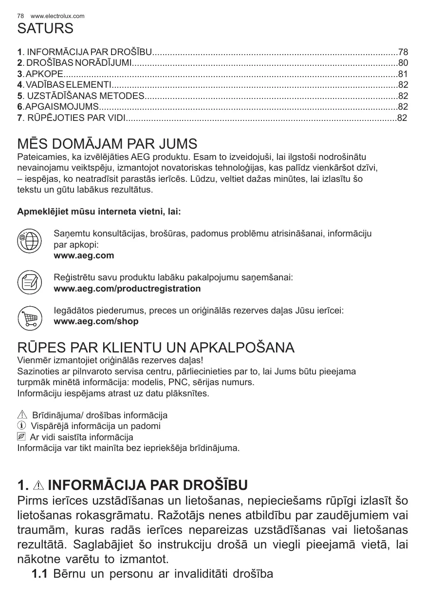 MĒS DOMĀJAM PAR JUMS Pateicamies, ka izvēlējāties AEG produktu. Esam to izveidojuši, lai ilgstoši nodrošinātu nevainojamu veiktspēju, izmantojot novatoriskas tehnoloģijas, kas palīdz vienkāršot dzīvi, – iespējas, ko neatradīsit parastās ierīcēs. Lūdzu, veltiet dažas minūtes, lai izlasītu šo tekstu un gūtu labākus rezultātus. Apmeklējiet mūsu interneta vietni, lai: Saņemtu konsultācijas, brošūras, padomus problēmu atrisināšanai, informāciju par apkopi: www.aeg.com Reģistrētu savu produktu labāku pakalpojumu saņemšanai: www.aeg.com/productregistration Iegādātos piederumus, preces un oriģinālās rezerves daļas Jūsu ierīcei: www.aeg.com/shop
