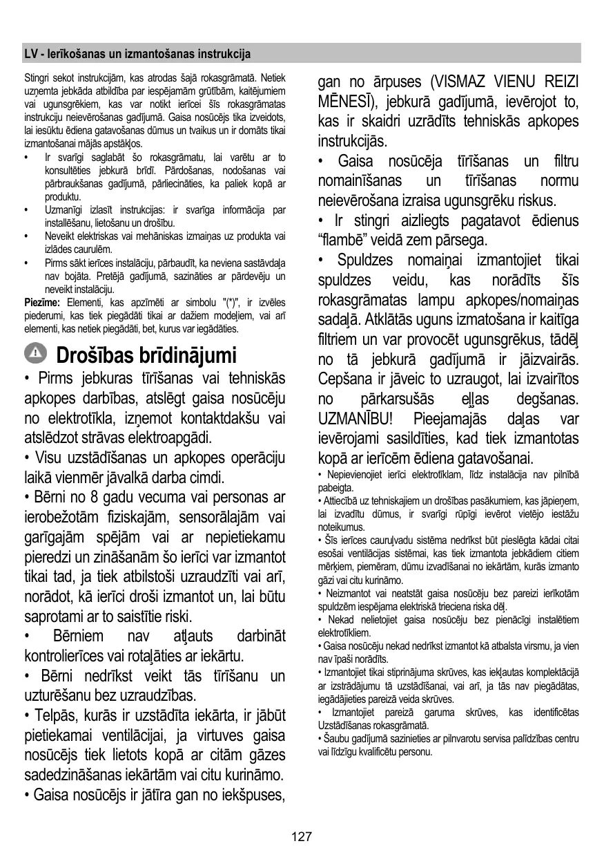 Drošības brīdinājumi • Pirms jebkuras tīrīšanas vai tehniskās apkopes darbības, atslēgt gaisa nosūcēju no elektrotīkla, izņemot kontaktdakšu vai atslēdzot strāvas elektroapgādi. • Visu uzstādīšanas un apkopes operāciju laikā vienmēr jāvalkā darba cimdi. • Bērni no 8 gadu vecuma vai personas ar ierobežotām fiziskajām, sensorālajām vai garīgajām spējām vai ar nepietiekamu pieredzi un zināšanām šo ierīci var izmantot tikai tad, ja tiek atbilstoši uzraudzīti vai arī, norādot, kā ierīci droši izmantot un, lai būtu saprotami ar to saistītie riski. • Bērniem nav atļauts darbināt kontrolierīces vai rotaļāties ar iekārtu. • Bērni nedrīkst veikt tās tīrīšanu un uzturēšanu bez uzraudzības. • Telpās, kurās ir uzstādīta iekārta, ir jābūt pietiekamai ventilācijai, ja virtuves gaisa nosūcējs tiek lietots kopā ar citām gāzes sadedzināšanas iekārtām vai citu kurināmo. • Gaisa nosūcējs ir jātīra gan no iekšpuses,
