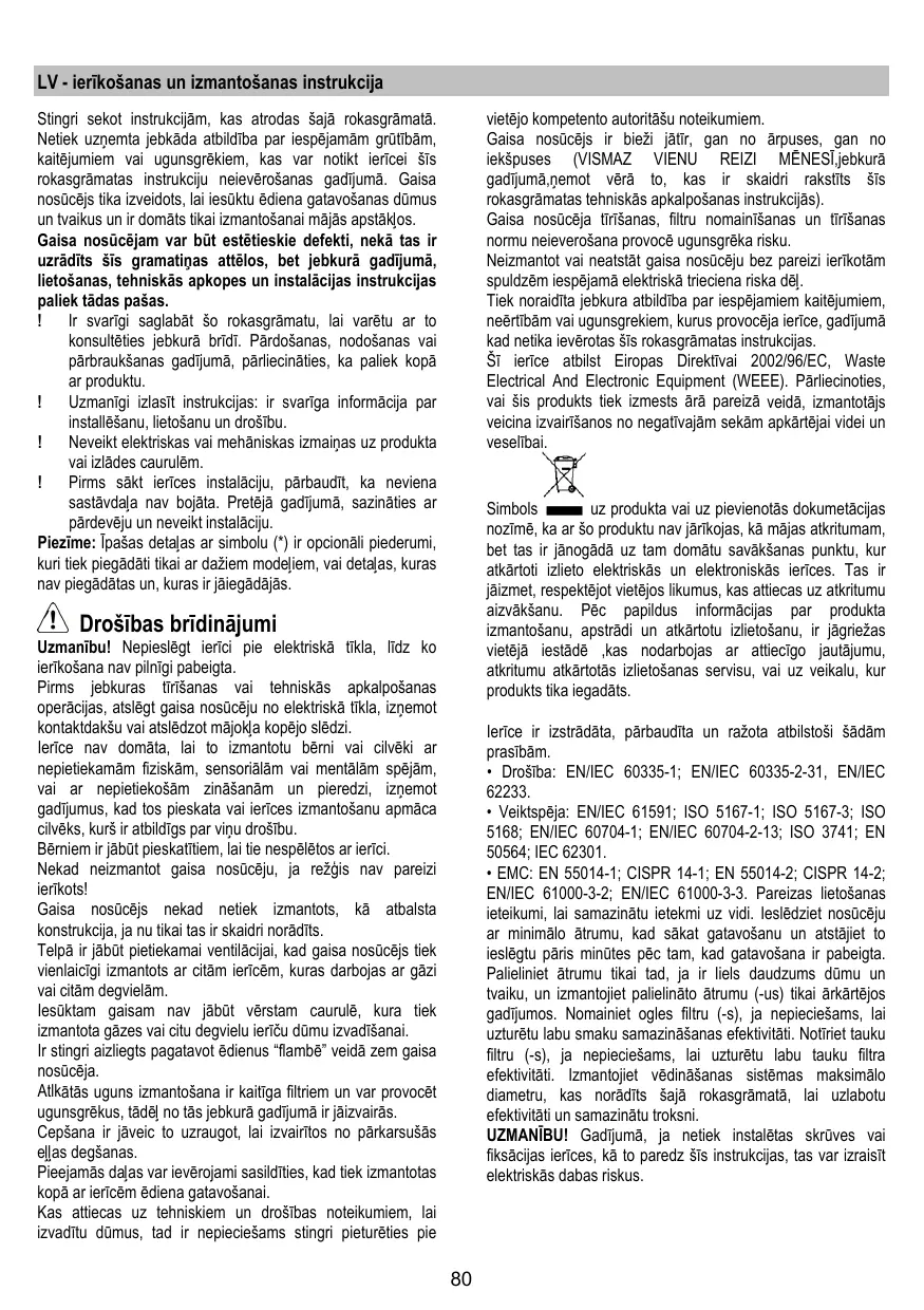 EMC: EN 55014-1; CISPR 14-1; EN 55014-2; CISPR 14-2; EN/IEC 61000-3-2; EN/IEC 61000-3-3. Pareizas lietošanas ieteikumi, lai samazinatu ietekmi uz vidi. lesledziet nosüčejur minimão atrumu, kad sākat gatavošanu un atstajet to ieslęgtu páris minutes péc tam, kad gatavošana ir pabeigta. Palielinet atrumu tikai tad, ja ir liels daudzums dūmu un tvaiku, un izmantojet palielino atrumu (-us) tikai arkartējos gadijumos. Nomainiet ogles filtru (-s), ja nepieciešams, lai uzturetú labu smaku samazinăsanas efektiviti. Notrijet tauku filtru (-s), ja nepieciešams, lai uzturetú labu tauku filtra efektiviti. Izmantojet védinašanas sistemas maksimão diamétru, kas noradits šajā rokasgrámată, lai uzlabotu efektiviti un samazinatu troksni.
