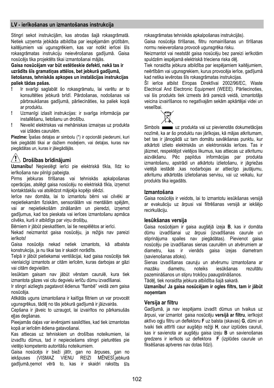 Dans l’éventualité où il ne serait pas possible d’évacuer les fumées et les vapeurs de cuisson vers l’extérieur, il est possible d’utiliser la hotte dans la version recylcage, en effectuant le montage d’un filtre à charbon actif et d’un déflecteur F sur le support (bride) G. Les fumées et les vapeurs sont recyclées à travers le grillage supérieur H, au moyen d’un tuyau d’évacuation connecté à la sortie d’air supérieure B et à la bague de connexion montée sur le déflecteur F (tuyau d’évacuation et colliers de fixation non fournis). Attention! Si la hotte est livrée sans filtre à charbon, celuici doit être commandé et monté avant la mise en service. Les modèles sans moteur d’aspiration fonctionnent uniquement dans la version aspirante et ils doivent être connectés à une unité périphérique d’aspiration (non fournie). Les instructions de raccordement sont fournies avec l’unité périphérique d’aspiration.