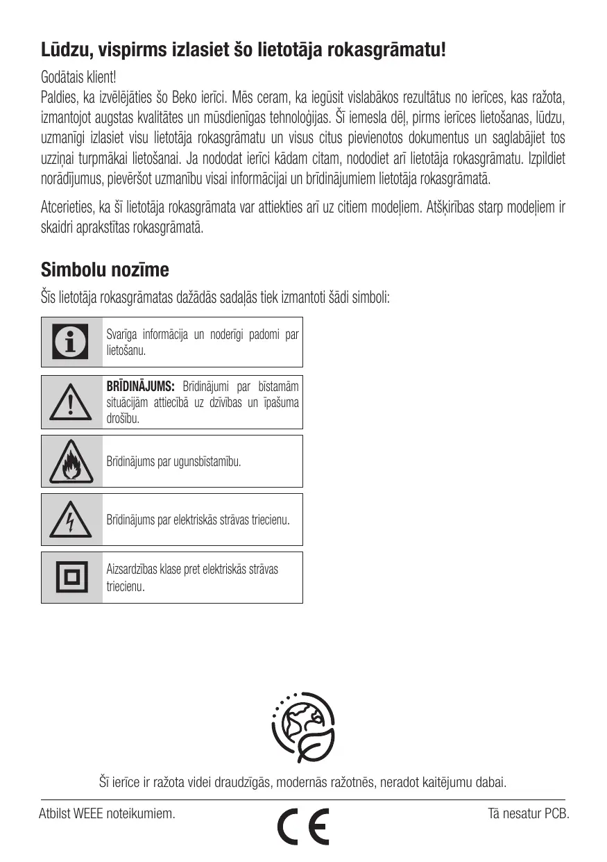 Lūdzu, vispirms izlasiet šo lietotāja rokasgrāmatu! Godātais klient! Paldies, ka izvēlējāties šo Beko ierīci. Mēs ceram, ka iegūsit vislabākos rezultātus no ierīces, kas ražota, izmantojot augstas kvalitātes un mūsdienīgas tehnoloģijas. Šī iemesla dēļ, pirms ierīces lietošanas, lūdzu, uzmanīgi izlasiet visu lietotāja rokasgrāmatu un visus citus pievienotos dokumentus un saglabājiet tos uzziņai turpmākai lietošanai. Ja nododat ierīci kādam citam, nododiet arī lietotāja rokasgrāmatu. Izpildiet norādījumus, pievēršot uzmanību visai informācijai un brīdinājumiem lietotāja rokasgrāmatā. Atcerieties, ka šī lietotāja rokasgrāmata var attiekties arī uz citiem modeļiem. Atšķirības starp modeļiem ir skaidri aprakstītas rokasgrāmatā.