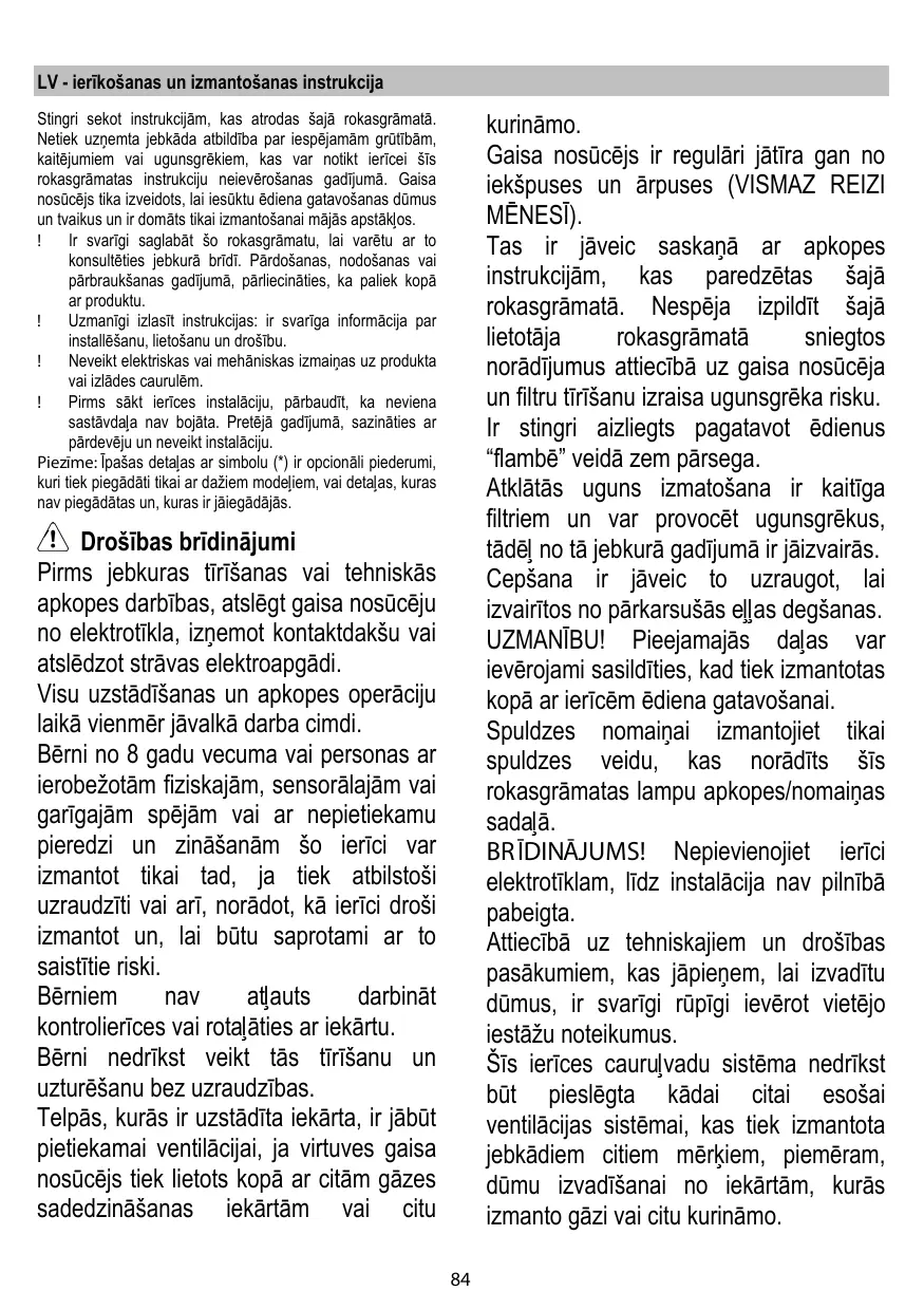 Drošības brīdinājumi Pirms jebkuras tīrīšanas vai tehniskās apkopes darbības, atslēgt gaisa nosūcēju no elektrotīkla, izņemot kontaktdakšu vai atslēdzot strāvas elektroapgādi. Visu uzstādīšanas un apkopes operāciju laikā vienmēr jāvalkā darba cimdi. Bērni no 8 gadu vecuma vai personas ar ierobežotām fiziskajām, sensorālajām vai garīgajām spējām vai ar nepietiekamu pieredzi un zināšanām šo ierīci var izmantot tikai tad, ja tiek atbilstoši uzraudzīti vai arī, norādot, kā ierīci droši izmantot un, lai būtu saprotami ar to saistītie riski. Bērniem nav atļauts darbināt kontrolierīces vai rotaļāties ar iekārtu. Bērni nedrīkst veikt tās tīrīšanu un uzturēšanu bez uzraudzības. Telpās, kurās ir uzstādīta iekārta, ir jābūt pietiekamai ventilācijai, ja virtuves gaisa nosūcējs tiek lietots kopā ar citām gāzes sadedzināšanas iekārtām vai citu 84