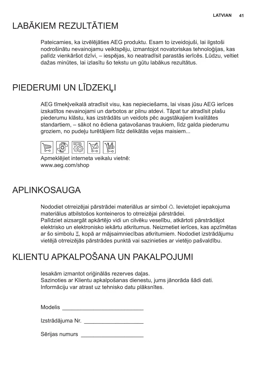 AEG tīmekļveikalā atradīsit visu, kas nepieciešams, lai visas jūsu AEG ierīces izskatītos nevainojami un darbotos ar pilnu atdevi. Tāpat tur atradīsit plašu piederumu klāstu, kas izstrādāts un veidots pēc augstākajiem kvalitātes standartiem, – sākot no ēdiena gatavošanas traukiem, līdz galda piederumu groziem, no pudeļu turētājiem līdz delikātās veļas maisiem... Apmeklējiet interneta veikalu vietnē: www.aeg.com/shop APLINKOSAUGA Nododiet otrreizējai pārstrādei materiālus ar simbol . Ievietojiet iepakojuma materiālus atbilstošos konteineros to otrreizējai pārstrādei. Palīdziet aizsargāt apkārtējo vidi un cilvēku veselību, atkārtoti pārstrādājot elektrisko un elektronisko iekārtu atkritumus. Neizmetiet ierīces, kas apzīmētas ar šo simbolu , kopā ar mājsaimniecības atkritumiem. Nododiet izstrādājumu vietējā otrreizējās pārstrādes punktā vai sazinieties ar vietējo pašvaldību.