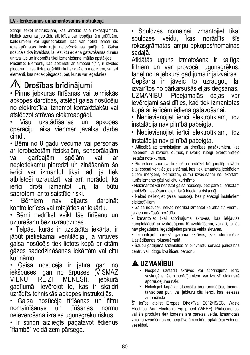 - Telpās, kurās ir uzstādīta iekārta, ir jābūt pietiekamai ventilācijai, ja virtuves gaisa nosücejs tiek lietots kopa ar citām gazes sadedzināsanas iekārtām vai citu kurināmo.