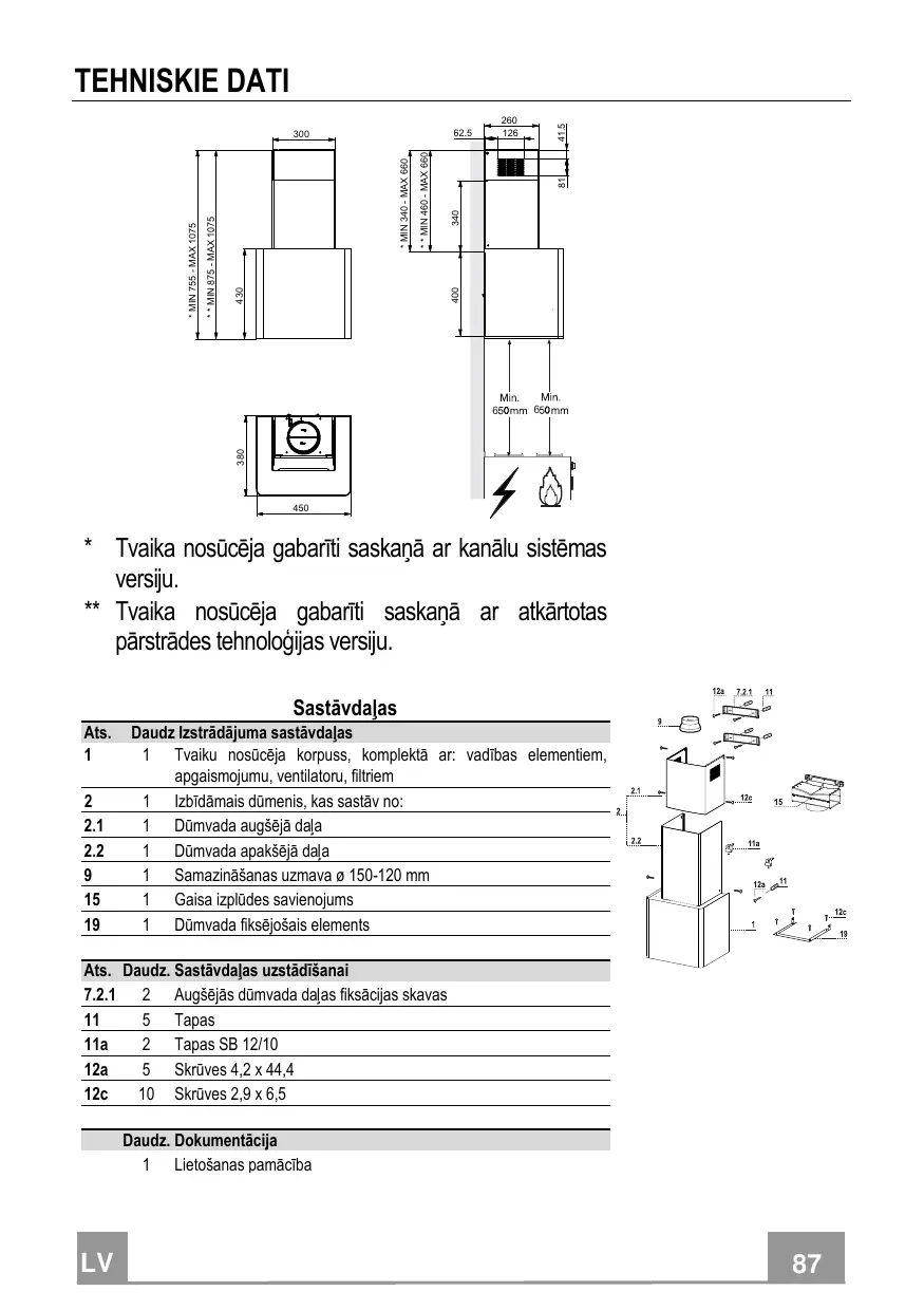 - Tvaika nosūcēja gabarīti saskaņā ar kanālu sistēmas versiju. ** Tvaika nosūcēja gabarīti saskaņā ar atkārtotas pārstrādes tehnoloģijas versiju. Sastāvdaļas Ats.