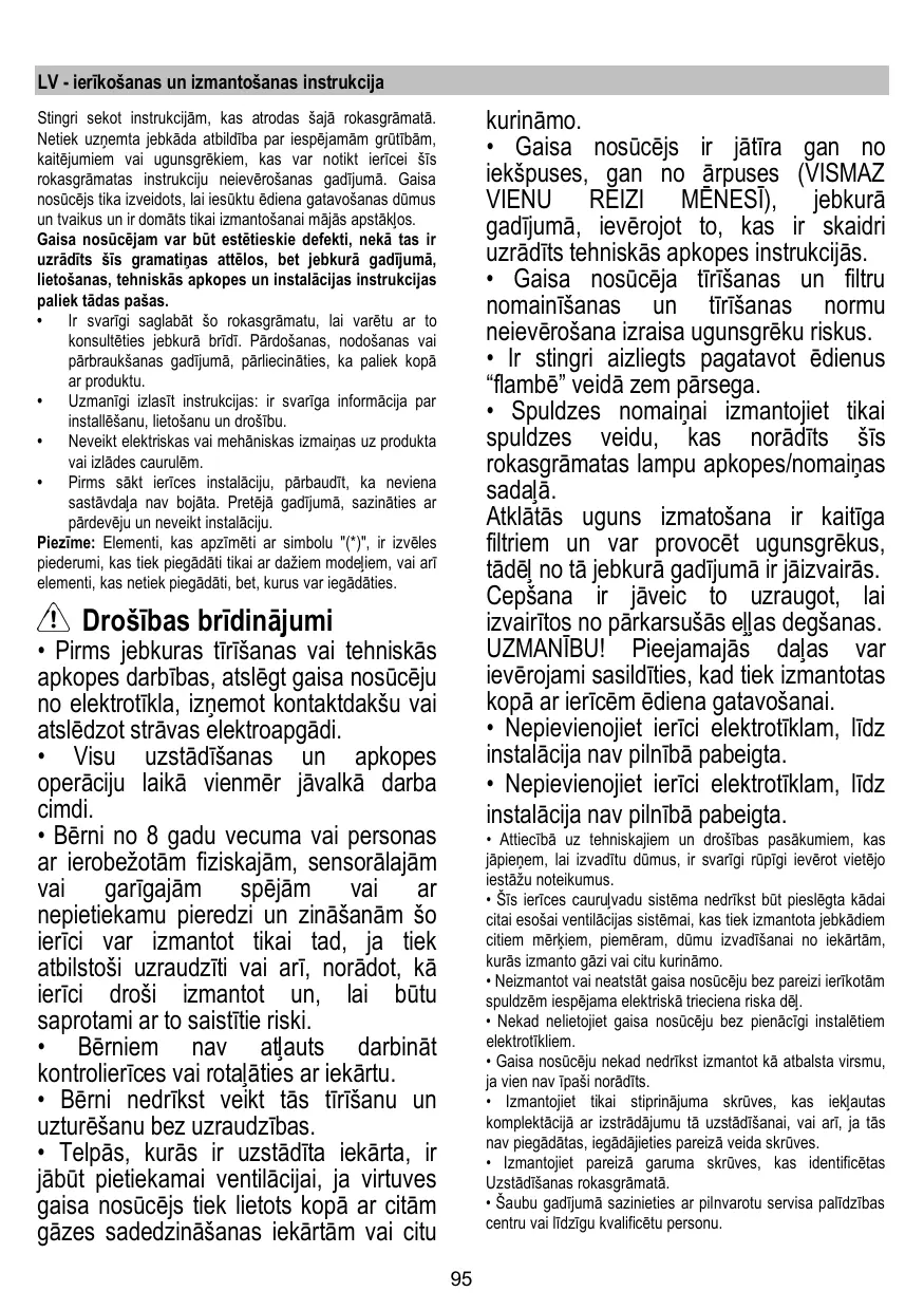 • Pirms jebkuras tīrīšanas vai tehniskās apkopes darbības, atslēgt gaisa nosūcēju no elektrotīkla, izņemot kontaktdakšu vai atslēdzot strāvas elektroapgādi. • Visu uzstādīšanas un apkopes operāciju laikā vienmēr jāvalkā darba cimdi. • Bērni no 8 gadu vecuma vai personas ar ierobežotām fiziskajām, sensorālajām vai garīgajām spējām vai ar nepietiekamu pieredzi un zināšanām šo ierīci var izmantot tikai tad, ja tiek atbilstoši uzraudzīti vai arī, norādot, kā ierīci droši izmantot un, lai būtu saprotami ar to saistītie riski. • Bērniem nav atļauts darbināt kontrolierīces vai rotaļāties ar iekārtu. • Bērni nedrīkst veikt tās tīrīšanu un uzturēšanu bez uzraudzības. • Telpās, kurās ir uzstādīta iekārta, ir jābūt pietiekamai ventilācijai, ja virtuves gaisa nosūcējs tiek lietots kopā ar citām gāzes sadedzināšanas iekārtām vai citu