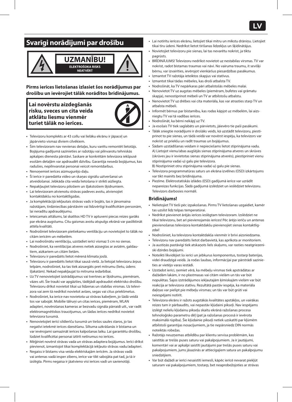Lai novērstu aizdegšanās risku, sveces un cita veida atklātu liesmu vienmēr turiet tālāk no ierīces. • Televizoru komplekts ar 43 collu vai lielāku ekrānu ir jāpaceļ un jāpārvieto vismaz diviem cilvēkiem. • Šim televizoram nav nevienas detaļas, kuru varētu remontēt lietotājs. Bojājuma gadījumā sazinieties ar ražotāju vai pilnvarotu tehniskās apkalpes dienesta pārstāvi. Saskare ar konkrētām televizora iekšpusē esošām detaļām var apdraudēt dzīvību. Garantija nesedz bojājumus, kas radušies, nepilnvarotai personai veicot remontdarbus. • Nenoņemiet ierīces aizmugurējo daļu. • Šī ierīce ir paredzēta video un skaņas signālu uztveršanai un atveidošanai. Jebkāda cita veida lietošana ir strikti aizliegta. • Nepakļaujiet televizoru pilošiem un šļakstošiem šķidrumiem. • Lai televizoram atvienotu strāvas padeves avotu, atvienojiet kontaktdakšu no kontaktligzdas. • Ja komplektācijā iekļautais strāvas vads ir bojāts, tas ir jānomaina ražotājam, tirdzniecības pārstāvim vai līdzvērtīgi kvalificētām personām, lai neradītu apdraudējumu. • Ieteicamais attālums, lai skatītos HD TV ir aptuveni piecas reizes garāks par ekrāna augstumu. Citu gaismas avotu atspulgs ekrānā var pasliktināt attēla kvalitāti. • Nodrošiniet televizoram pietiekamu ventilāciju un novietojiet to tālāk no citām ierīcēm un mēbelēm. • Lai nodrošinātu ventilāciju, uzstādiet ierīci vismaz 5 cm no sienas. • Nodrošiniet, ka ventilācijas atveres netiek aizsegtas ar avīzēm, galdautiem, aizkariem un citām lietām. • Televizoru ir paredzēts lietot mērenā klimata joslā. • Televizoru ir paredzēts lietot tikai sausā vietā. Ja lietojat televizoru ārpus telpām, nodrošiniet, ka tas tiek aizsargāts pret mitrumu (lietu, ūdens šļakatām). Nekad nepakļaujat to mitruma iedarbībai. • Uz TV nenovietojiet izstrādājumus vai tvertnes ar šķidrumu, piemēram, vāzes utt. Šie trauki var apgāzties, tādējādi apdraudot elektrisko drošību. Televizoru drīkst novietot tikai uz līdzenas un stabilas virsmas. Uz televizora vai zem tā nedrīkst novietot avīzes, segas vai citus priekšmetus. • Nodrošiniet, ka ierīce nav novietota uz strāvas kabeļiem, jo šādā veidā tos var sabojāt. Mobilie tālruņi un citas ierīces, piemēram, WLAN adapteri, novērošanas kameras ar bezvadu signāla pārraidi utt., var radīt elektromagnētiskos traucējumus, un šādas ierīces nedrīkst novietot televizora tuvumā. • Nenovietojiet ierīci sildierīču tuvumā un tiešos saules staros, jo tas negatīvi ietekmē ierīces dzesēšanu. Siltuma uzkrāšanās ir bīstama un var ievērojami samazināt ierīces kalpošanas laiku. Lai garantētu drošību, lūdziet kvalificētai personai iztīrīt netīrumus no ierīces. • Mēģiniet novērst strāvas vada un strāvas adaptera bojājumus. Ierīci drīkst pievienot, izmantojot tikai komplektācijā iekļauto strāvas vadu/adapteri. • Negaiss ir bīstams visa veida elektriskajām ierīcēm. Ja strāvas vadā vai antenas vadā iesper zibens, ierīce var tikt sabojāta pat tad, ja tā ir izslēgta. Pirms negaisa ir jāatvieno visi ierīces vadi un savienotāji.