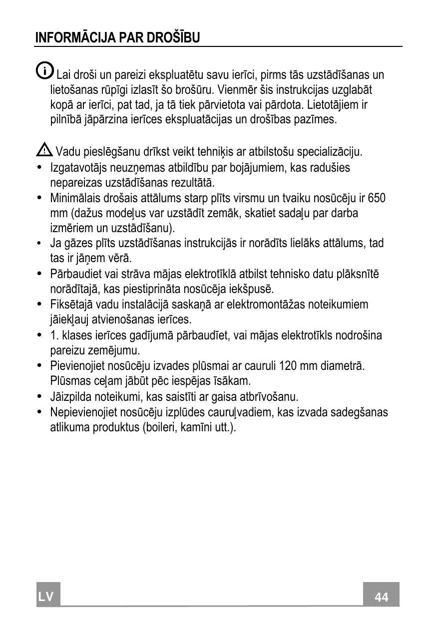Compruebe que la tensión de red coincide con la indicada en la placa de características del interior de la campana. Los dispositivos de desconexión deben instalarse en la instalación fija de acuerdo con las regulaciones para sistemas de cableado. Para los aparatos de la clase I, compruebe que el suministro de corriente eléctrica de la casa tiene una conexión a tierra adecuada. Conecte la campana a la chimenea con un tubo de un diámetro mínimo de 120 mm. El trayecto de humos debe ser lo más corto posible. Deben observarse todas las normas relativas al escape de aire. No conecte la campana extractora a los conductos de humos de combustión (p. ej. calderas, chimeneas, etc.).