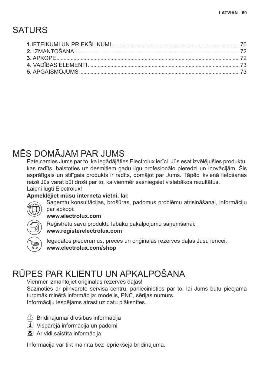 MĒS DOMĀJAM PAR JUMS Pateicamies Jums par to, ka iegādājāties Electrolux ierīci. Jūs esat izvēlējušies produktu, kas radīts, balstoties uz desmitiem gadu ilgu profesionālo pieredzi un inovācijām. Šis asprātīgais un stilīgais produkts ir radīts, domājot par Jums. Tāpēc ikvienā lietošanas reizē Jūs varat būt droši par to, ka vienmēr sasniegsiet vislabākos rezultātus. Laipni lūgti Electrolux! Apmeklējiet mūsu interneta vietni, lai: Saņemtu konsultācijas, brošūras, padomus problēmu atrisināšanai, informāciju par apkopi: www.electrolux.com Reģistrētu savu produktu labāku pakalpojumu saņemšanai: www.registerelectrolux.com Iegādātos piederumus, preces un oriģinālās rezerves daļas Jūsu ierīcei: www.electrolux.com/shop