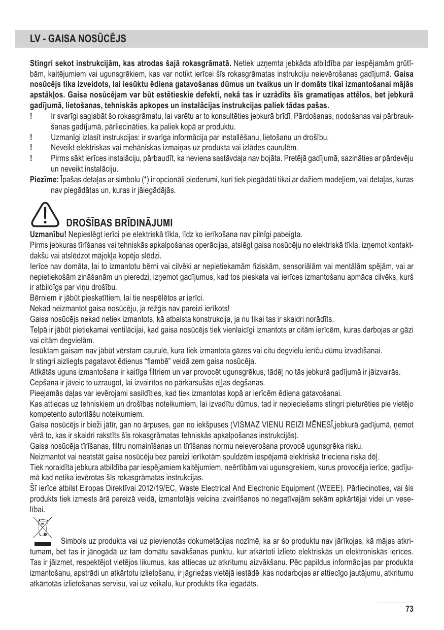 DROŠĪBAS BRĪDINĀJUMI Uzmanību! Nepieslēgt ierīci pie elektriskā tīkla, līdz ko ierīkošana nav pilnīgi pabeigta. Pirms jebkuras tīrīšanas vai tehniskās apkalpošanas operācijas, atslēgt gaisa nosūcēju no elektriskā tīkla, izņemot kontaktdakšu vai atslēdzot mājokļa kopējo slēdzi. Ierīce nav domāta, lai to izmantotu bērni vai cilvēki ar nepietiekamām fiziskām, sensoriālām vai mentālām spējām, vai ar nepietiekošām zināšanām un pieredzi, izņemot gadījumus, kad tos pieskata vai ierīces izmantošanu apmāca cilvēks, kurš ir atbildīgs par viņu drošību. Bērniem ir jābūt pieskatītiem, lai tie nespēlētos ar ierīci. Nekad neizmantot gaisa nosūcēju, ja režģis nav pareizi ierīkots! Gaisa nosūcējs nekad netiek izmantots, kā atbalsta konstrukcija, ja nu tikai tas ir skaidri norādīts. Telpā ir jābūt pietiekamai ventilācijai, kad gaisa nosūcējs tiek vienlaicīgi izmantots ar citām ierīcēm, kuras darbojas ar gāzi vai citām degvielām. Iesūktam gaisam nav jābūt vērstam caurulē, kura tiek izmantota gāzes vai citu degvielu ierīču dūmu izvadīšanai. Ir stingri aizliegts pagatavot ēdienus “flambē” veidā zem gaisa nosūcēja. Atlkātās uguns izmantošana ir kaitīga filtriem un var provocēt ugunsgrēkus, tādēļ no tās jebkurā gadījumā ir jāizvairās. Cepšana ir jāveic to uzraugot, lai izvairītos no pārkarsušās eļļas degšanas. Pieejamās daļas var ievērojami sasildīties, kad tiek izmantotas kopā ar ierīcēm ēdiena gatavošanai. Kas attiecas uz tehniskiem un drošības noteikumiem, lai izvadītu dūmus, tad ir nepieciešams stingri pieturēties pie vietējo kompetento autoritāšu noteikumiem. Gaisa nosūcējs ir bieži jātīr, gan no ārpuses, gan no iekšpuses (VISMAZ VIENU REIZI MĒNESĪ,jebkurā gadījumā, ņemot vērā to, kas ir skaidri rakstīts šīs rokasgrāmatas tehniskās apkalpošanas instrukcijās). Gaisa nosūcēja tīrīšanas, filtru nomainīšanas un tīrīšanas normu neieverošana provocē ugunsgrēka risku. Neizmantot vai neatstāt gaisa nosūcēju bez pareizi ierīkotām spuldzēm iespējamā elektriskā trieciena riska dēļ. Tiek noraidīta jebkura atbildība par iespējamiem kaitējumiem, neērtībām vai ugunsgrekiem, kurus provocēja ierīce, gadījumā kad netika ievērotas šīs rokasgrāmatas instrukcijas. Šī ierīce atbilst Eiropas Direktīvai 2012/19/EC, Waste Electrical And Electronic Equipment (WEEE). Pārliecinoties, vai šis produkts tiek izmests ārā pareizā veidā, izmantotājs veicina izvairīšanos no negatīvajām sekām apkārtējai videi un veselībai. Simbols uz produkta vai uz pievienotās dokumetācijas nozīmē, ka ar šo produktu nav jārīkojas, kā mājas atkritumam, bet tas ir jānogādā uz tam domātu savākšanas punktu, kur atkārtoti izlieto elektriskās un elektroniskās ierīces. Tas ir jāizmet, respektējot vietējos likumus, kas attiecas uz atkritumu aizvākšanu. Pēc papildus informācijas par produkta izmantošanu, apstrādi un atkārtotu izlietošanu, ir jāgriežas vietējā iestādē ,kas nodarbojas ar attiecīgo jautājumu, atkritumu atkārtotās izlietošanas servisu, vai uz veikalu, kur produkts tika iegadāts. 73