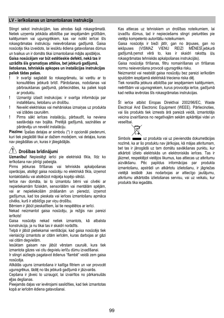 Suivre impérativement les instructions de cette notice. Le constructeur décline toute responsabilité pour tous les inconvénients, dommages ou incendies provoqués à l’appareil et dûs à la non observation des instructions de la présente notice. Cette hotte prévue pour l’aspiration des fumées et vapeurs de cuisson est destinée à un usage domestique exclusivement.