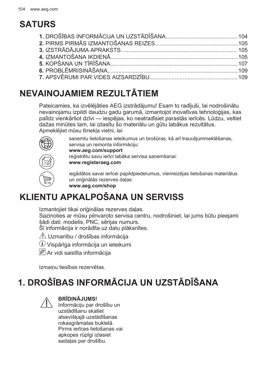 SATURS 1. DROŠĪBAS INFORMĀCIJA UN UZSTĀDĪŠANA104 2. PIRMS PIRMĀS IZMANTOŠANAS REIZES105 3. IZSTRĀDĀJUMA APRAKSTS 105 4. IZMANTOŠANA IKDIENĀ105 5. KOPŠANA UN TĪRĪŠANA 107 6. PROBLĒMRISINĀŠANA109 7. APSVĒRUMI PAR VIDES AIZSARDZĪBU 109