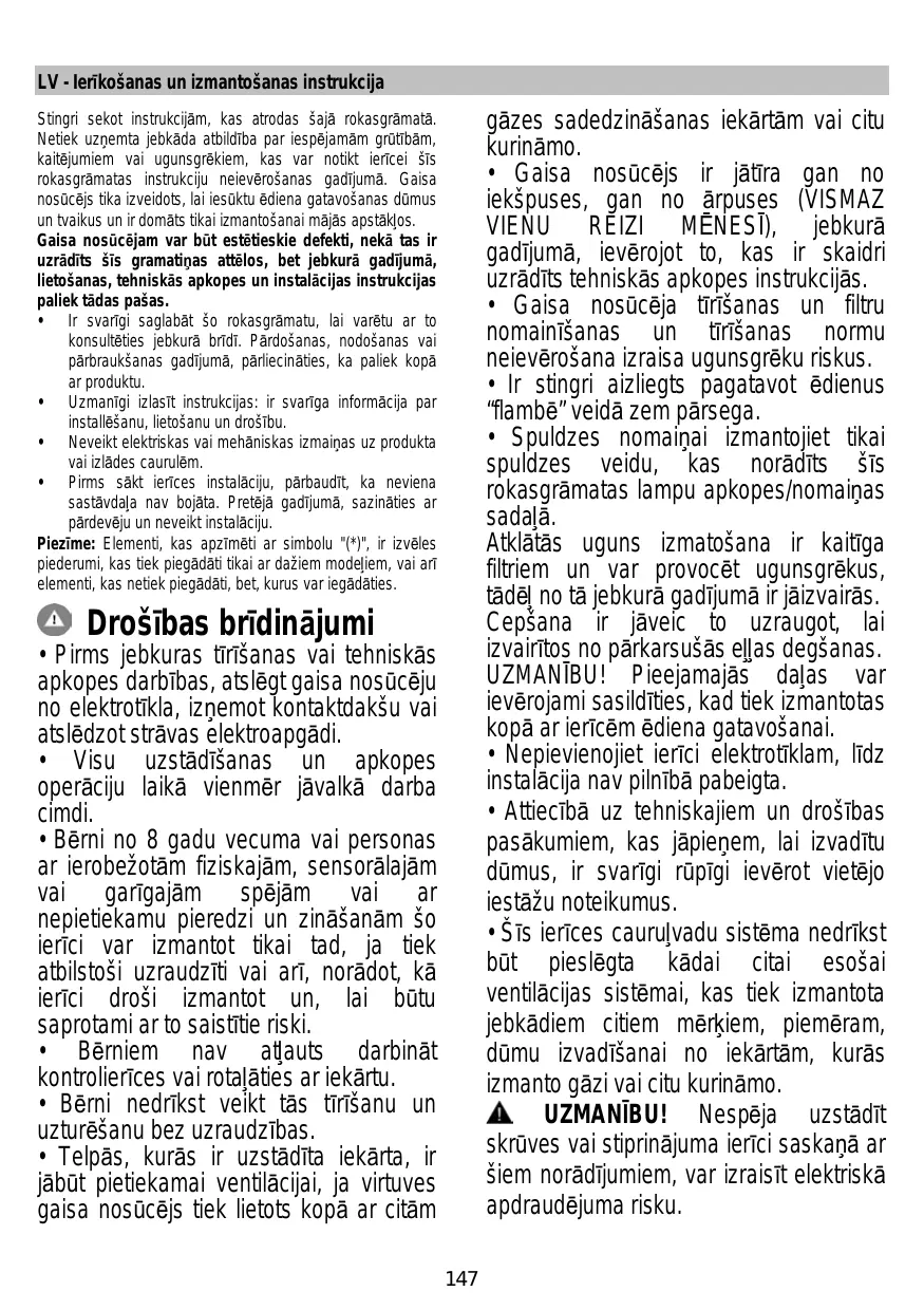 également après l’installation, appliquez un disjoncteur normalisé pour assurer de débrancher complètement la hotte du circuit électrique en conditions de catégorie surtension III, conformément aux règlementations de montage. ATTENTION! Avant de rebrancher le circuit de la hotte à l’alimentation électrique et d’en vérifier le fonctionnement correct, contrôlez toujours que le câble d’alimentation soit monté correctement.