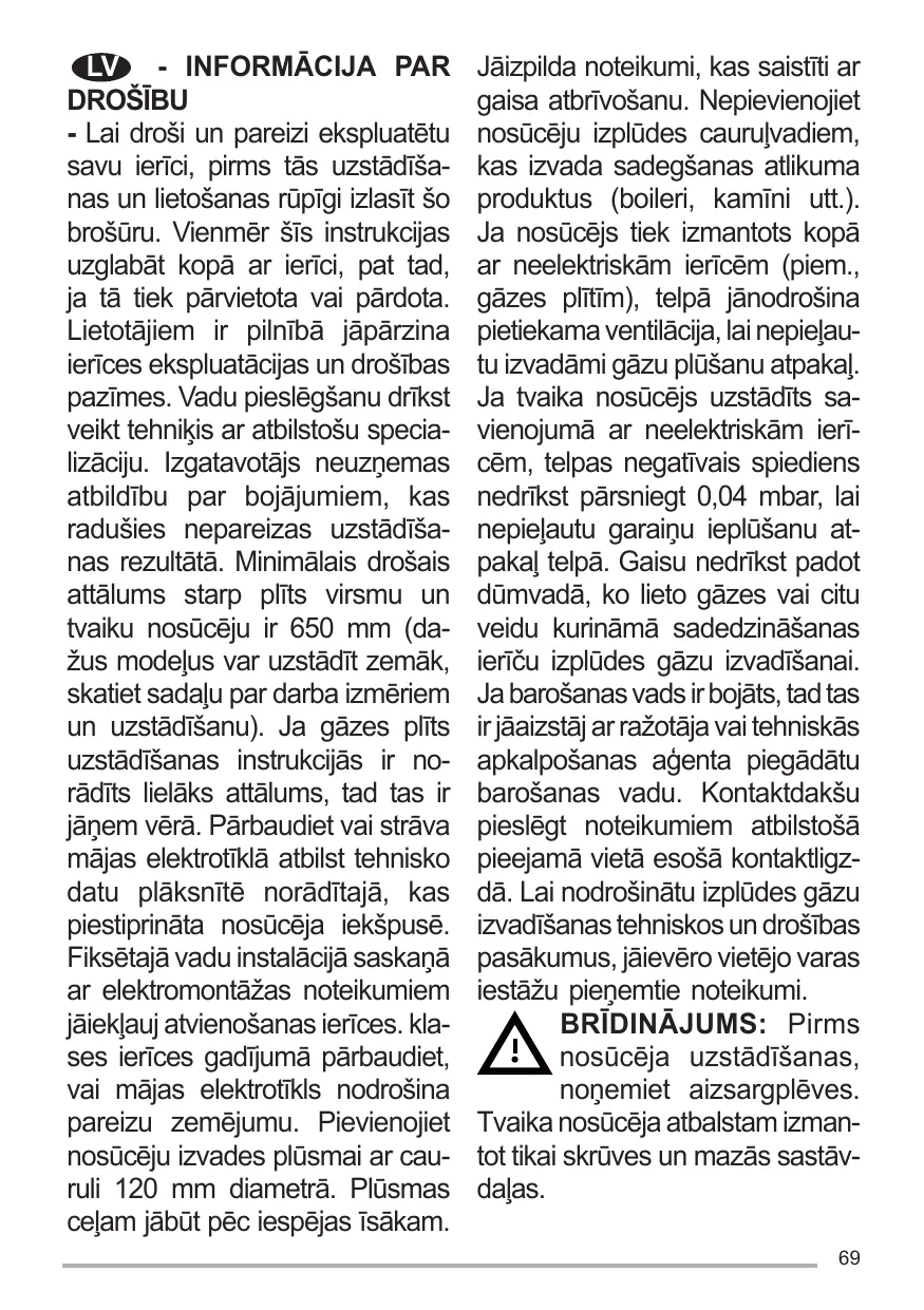 Jāizpilda noteikumi, kas saistīti ar gaisa atbrīvošanu. Nepievienojiet nosūcēju izplūdes cauruļvadiem, kas izvada sadegšanas atlikuma produktus (boileri, kamīni utt.). Ja nosūcējs tiek izmantots kopā ar neelektriskām ierīcēm (piem., gāzes plītīm), telpā jānodrošina pietiekama ventilācija, lai nepieļautu izvadāmi gāzu plūšanu atpakaļ. Ja tvaika nosūcējs uzstādīts savienojumā ar neelektriskām ierīcēm, telpas negatīvais spiediens nedrīkst pārsniegt 0,04 mbar, lai nepieļautu garaiņu ieplūšanu atpakaļ telpā. Gaisu nedrīkst padot dūmvadā, ko lieto gāzes vai citu veidu kurināmā sadedzināšanas ierīču izplūdes gāzu izvadīšanai. Ja barošanas vads ir bojāts, tad tas ir jāaizstāj ar ražotāja vai tehniskās apkalpošanas aģenta piegādātu barošanas vadu. Kontaktdakšu pieslēgt noteikumiem atbilstošā pieejamā vietā esošā kontaktligzdā. Lai nodrošinātu izplūdes gāzu izvadīšanas tehniskos un drošības pasākumus, jāievēro vietējo varas iestāžu pieņemtie noteikumi. BRĪDINĀJUMS: Pirms nosūcēja uzstādīšanas, noņemiet aizsargplēves. Tvaika nosūcēja atbalstam izmantot tikai skrūves un mazās sastāvdaļas. 69