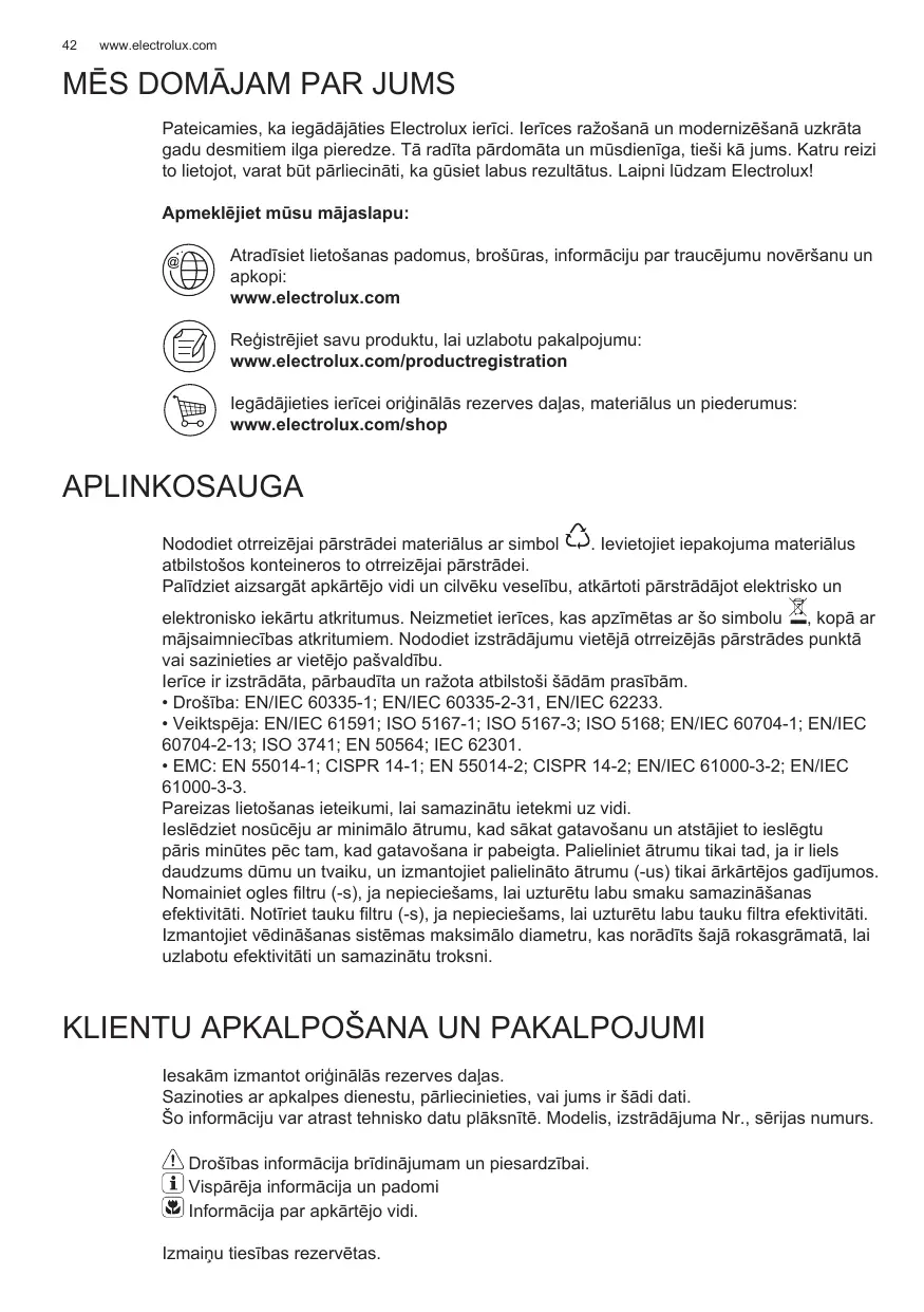 Pateicamies, ka iegādājāties Electrolux ierīci. Ierīces ražošanā un modernizēšanā uzkrāta gadu desmitiem ilga pieredze. Tā radīta pārdomāta un mūsdienīga, tieši kā jums. Katru reizi to lietojot, varat būt pārliecināti, ka gūsiet labus rezultātus. Laipni lūdzam Electrolux! Apmeklējiet mūsu mājaslapu: Atradīsiet lietošanas padomus, brošūras, informāciju par traucējumu novēršanu un apkopi: www.electrolux.com Reģistrējiet savu produktu, lai uzlabotu pakalpojumu: www.electrolux.com/productregistration Iegādājieties ierīcei oriģinālās rezerves daļas, materiālus un piederumus: www.electrolux.com/shop APLINKOSAUGA Nododiet otrreizējai pārstrādei materiālus ar simbol . Ievietojiet iepakojuma materiālus atbilstošos konteineros to otrreizējai pārstrādei. Palīdziet aizsargāt apkārtējo vidi un cilvēku veselību, atkārtoti pārstrādājot elektrisko un elektronisko iekārtu atkritumus. Neizmetiet ierīces, kas apzīmētas ar šo simbolu , kopā ar mājsaimniecības atkritumiem. Nododiet izstrādājumu vietējā otrreizējās pārstrādes punktā vai sazinieties ar vietējo pašvaldību. Ierīce ir izstrādāta, pārbaudīta un ražota atbilstoši šādām prasībām.