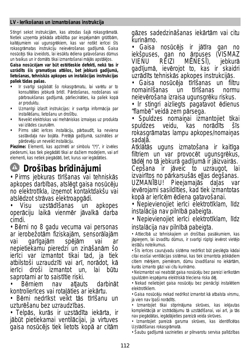 Si l’esthétique du produit est réalisée avec un matériau spécial et non standard pour le type d’application de hotte, comme le bois, le grès porcelainé et le Krion, tout signe distinctif, variation de couleur ou déformation superficielle ne doit pas être considéré comme un défaut mais comme une caractéristique du matériau.