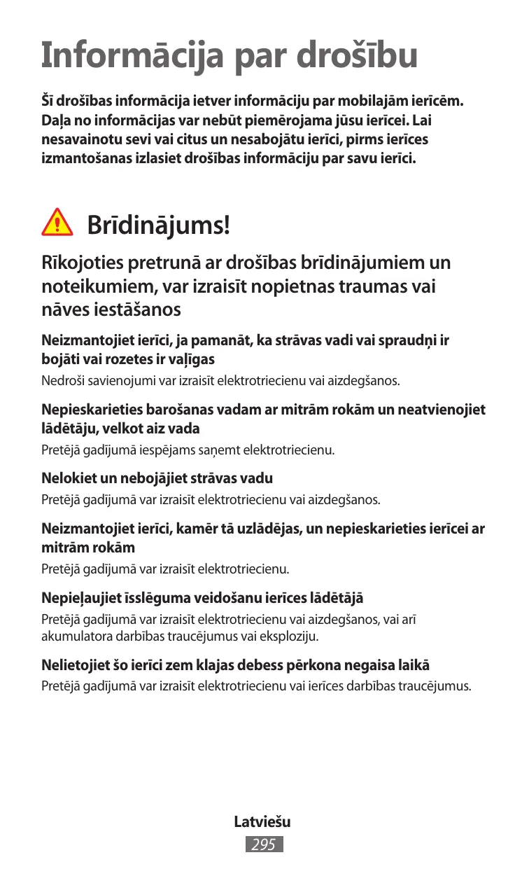 Informācija par drošību Šī drošības informācija ietver informāciju par mobilajām ierīcēm. Daļa no informācijas var nebūt piemērojama jūsu ierīcei. Lai nesavainotu sevi vai citus un nesabojātu ierīci, pirms ierīces izmantošanas izlasiet drošības informāciju par savu ierīci. Brīdinājums! Rīkojoties pretrunā ar drošības brīdinājumiem un noteikumiem, var izraisīt nopietnas traumas vai nāves iestāšanos Neizmantojiet ierīci, ja pamanāt, ka strāvas vadi vai spraudņi ir bojāti vai rozetes ir vaļīgas Nedroši savienojumi var izraisīt elektrotriecienu vai aizdegšanos. Nepieskarieties barošanas vadam ar mitrām rokām un neatvienojiet lādētāju, velkot aiz vada Pretējā gadījumā iespējams saņemt elektrotriecienu. Nelokiet un nebojājiet strāvas vadu Pretējā gadījumā var izraisīt elektrotriecienu vai aizdegšanos. Neizmantojiet ierīci, kamēr tā uzlādējas, un nepieskarieties ierīcei ar mitrām rokām Pretējā gadījumā var izraisīt elektrotriecienu. Nepieļaujiet īsslēguma veidošanu ierīces lādētājā Pretējā gadījumā var izraisīt elektrotriecienu vai aizdegšanos, vai arī akumulatora darbības traucējumus vai eksploziju. Nelietojiet šo ierīci zem klajas debess pērkona negaisa laikā Pretējā gadījumā var izraisīt elektrotriecienu vai ierīces darbības traucējumus. Latviešu