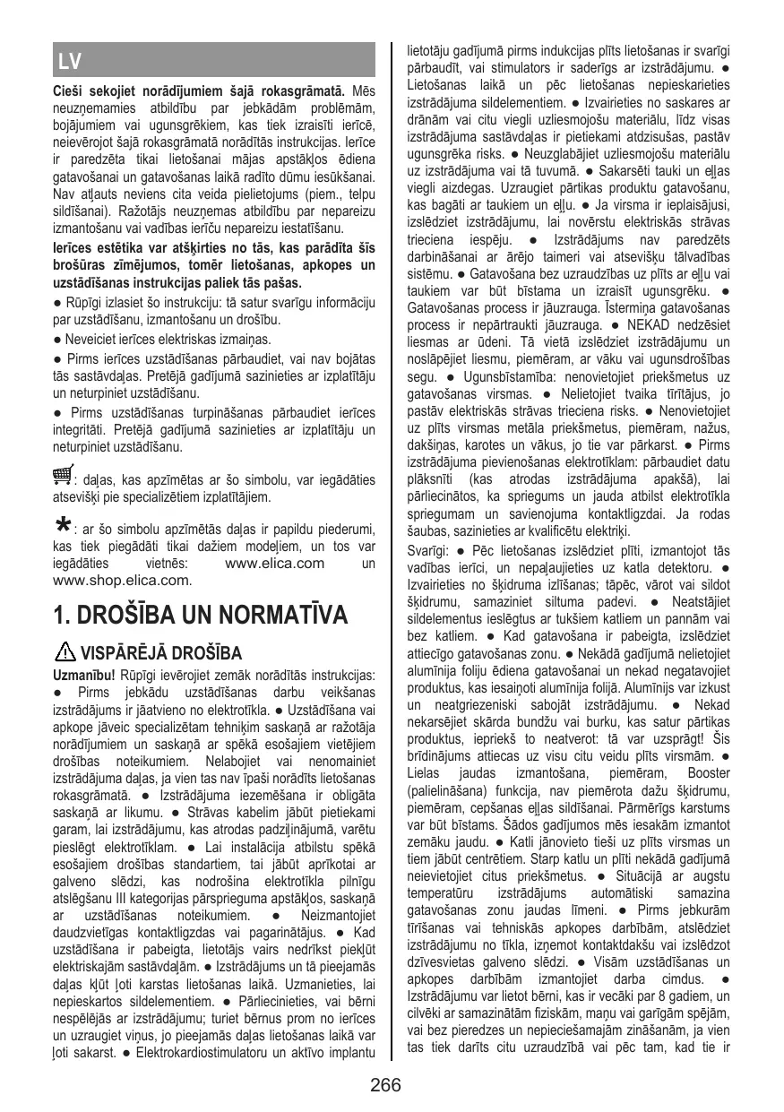 lietotāju gadījumā pirms indukcijas plīts lietošanas ir svarīgi pārbaudīt, vai stimulators ir saderīgs ar izstrādājumu. ● Lietošanas laikā un pēc lietošanas nepieskarieties izstrādājuma sildelementiem. ● Izvairieties no saskares ar drānām vai citu viegli uzliesmojošu materiālu, līdz visas izstrādājuma sastāvdaļas ir pietiekami atdzisušas, pastāv ugunsgrēka risks. ● Neuzglabājiet uzliesmojošu materiālu uz izstrādājuma vai tā tuvumā. ● Sakarsēti tauki un eļļas viegli aizdegas. Uzraugiet pārtikas produktu gatavošanu, kas bagāti ar taukiem un eļļu. ● Ja virsma ir ieplaisājusi, izslēdziet izstrādājumu, lai novērstu elektriskās strāvas trieciena iespēju. ● Izstrādājums nav paredzēts darbināšanai ar ārējo taimeri vai atsevišķu tālvadības sistēmu. ● Gatavošana bez uzraudzības uz plīts ar eļļu vai taukiem var būt bīstama un izraisīt ugunsgrēku. ● Gatavošanas process ir jāuzrauga. Īstermiņa gatavošanas process ir nepārtraukti jāuzrauga. ● NEKAD nedzēsiet liesmas ar ūdeni. Tā vietā izslēdziet izstrādājumu un noslāpējiet liesmu, piemēram, ar vāku vai ugunsdrošības segu. ● Ugunsbīstamība: nenovietojiet priekšmetus uz gatavošanas virsmas. ● Nelietojiet tvaika tīrītājus, jo pastāv elektriskās strāvas trieciena risks. ● Nenovietojiet uz plīts virsmas metāla priekšmetus, piemēram, nažus, dakšiņas, karotes un vākus, jo tie var pārkarst. ● Pirms izstrādājuma pievienošanas elektrotīklam: pārbaudiet datu plāksnīti (kas atrodas izstrādājuma apakšā), lai pārliecinātos, ka spriegums un jauda atbilst elektrotīkla spriegumam un savienojuma kontaktligzdai. Ja rodas šaubas, sazinieties ar kvalificētu elektriķi. Svarīgi: ● Pēc lietošanas izslēdziet plīti, izmantojot tās vadības ierīci, un nepaļaujieties uz katla detektoru. ● Izvairieties no šķidruma izlīšanas; tāpēc, vārot vai sildot šķidrumu, samaziniet siltuma padevi. ● Neatstājiet sildelementus ieslēgtus ar tukšiem katliem un pannām vai bez katliem. ● Kad gatavošana ir pabeigta, izslēdziet attiecīgo gatavošanas zonu. ● Nekādā gadījumā nelietojiet alumīnija foliju ēdiena gatavošanai un nekad negatavojiet produktus, kas iesaiņoti alumīnija folijā. Alumīnijs var izkust un neatgriezeniski sabojāt izstrādājumu. ● Nekad nekarsējiet skārda bundžu vai burku, kas satur pārtikas produktus, iepriekš to neatverot: tā var uzsprāgt! Šis brīdinājums attiecas uz visu citu veidu plīts virsmām. ● Lielas jaudas izmantošana, piemēram, Booster (palielināšana) funkcija, nav piemērota dažu šķidrumu, piemēram, cepšanas eļļas sildīšanai. Pārmērīgs karstums var būt bīstams. Šādos gadījumos mēs iesakām izmantot zemāku jaudu. ● Katli jānovieto tieši uz plīts virsmas un tiem jābūt centrētiem. Starp katlu un plīti nekādā gadījumā neievietojiet citus priekšmetus. ● Situācijā ar augstu temperatūru izstrādājums automātiski samazina gatavošanas zonu jaudas līmeni. ● Pirms jebkurām tīrīšanas vai tehniskās apkopes darbībām, atslēdziet izstrādājumu no tīkla, izņemot kontaktdakšu vai izslēdzot dzīvesvietas galveno slēdzi. ● Visām uzstādīšanas un apkopes darbībām izmantojiet darba cimdus. ● Izstrādājumu var lietot bērni, kas ir vecāki par 8 gadiem, un cilvēki ar samazinātām fiziskām, maņu vai garīgām spējām, vai bez pieredzes un nepieciešamajām zināšanām, ja vien tas tiek darīts citu uzraudzībā vai pēc tam, kad tie ir saņēmuši norādījumus par drošu ierīces lietošanu un sapratuši ar izstrādājumu saistītos riskus. ● Bērni ir jāuzrauga, lai pārliecinātos, ka viņi nespēlējas ar izstrādājumu. ● Tīrīšanu un apkopi bērni nedrīkst veikt bez uzraudzības. ● Telpā jābūt pietiekamai ventilācijai, ja izstrādājumu lieto vienlaikus ar citām ierīcēm, kas sadedzina gāzi vai citu degvielu. ● Izstrādājums ir bieži jātīra gan no iekšpuses, gan no ārpuses (VISMAZ VIENU REIZI MĒNESĪ), katrā ziņā ievērojot apkopes instrukcijās skaidri norādīto. ● Izstrādājuma tīrīšanas noteikumu un filtru nomaiņas/tīrīšanas neievērošana rada ugunsgrēka riska. ● Flambēšanas gatavošana ir stingri aizliegta. ● Atklātas liesmas izmantošana filtriem ir kaitīga un var izraisīt ugunsgrēku, tāpēc no tā jebkurā gadījumā ir jāizvairās. ● Cepšana jāveic kontrolētā veidā, lai nepieļautu pārkarsētas eļļas aizdegšanos. ● Uzmanību! Kad plīts darbojas, ierīces pieejamās daļas var sakarst. ● Uzmanību! Nepievienojiet izstrādājumu elektrotīklam, kamēr instalēšana nav pabeigta. ● Attiecībā uz tehniskajiem un drošības pasākumiem, kas jāveic dūmu novadīšanai, stingri ievērojiet kompetento vietējo iestāžu. ● Iesūcamo gaisu nedrīkst novadīt kanālā, kuru izmanto dūmu, ko rada gāze vai citas degvielas sadedzināšanas ierīces,. ● Nekad nelietojiet izstrādājumu bez pareizi uzstādīta restes! ● Uzstādīšanai izmantojiet tikai stiprinājuma skrūves, kuras piegādātas kopā ar izstrādājumu, vai, ja tās nav piegādātas, iegādājieties piemērota veida skrūves. Lietojiet pareizu skrūvju garumu, kas ir norādītas Uzstādīšanas rokasgrāmatā. ● Ja šis izstrādājums un citas ierīces, kas darbojas ar enerģiju, kas nav elektrība, darbojas vienlaikus, negatīvais spiediens telpā nedrīkst pārsniegt 4 Pa (4 × 10-5 bāri). ● Ir svarīgi saglabāt šo rokasgrāmatu tā, lai tā būtu pieejama uzziņai. Ja izstrādājums tiek pārdots, nodots vai pārvietots, pārliecinieties, vai rokasgrāmata joprojām ir kopā ar izstrādājumu.