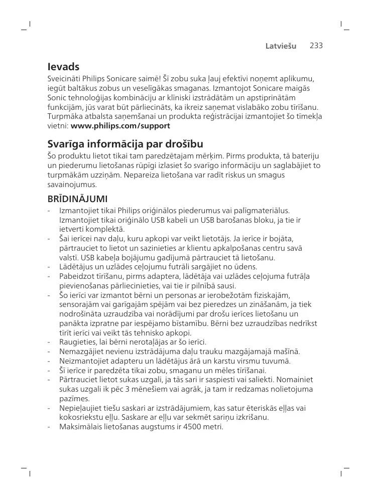 Izmantojiet tikai Philips oriģinālos piederumus vai palīgmateriālus. Izmantojiet tikai oriģinālo USB kabeli un USB barošanas bloku, ja tie ir ietverti komplektā. Šai ierīcei nav daļu, kuru apkopi var veikt lietotājs. Ja ierīce ir bojāta, pārtrauciet to lietot un sazinieties ar klientu apkalpošanas centru savā valstī. USB kabeļa bojājumu gadījumā pārtrauciet tā lietošanu. Lādētājus un uzlādes ceļojumu futrāli sargājiet no ūdens. Pabeidzot tīrīšanu, pirms adaptera, lādētāja vai uzlādes ceļojuma futrāļa pievienošanas pārliecinieties, vai tie ir pilnībā sausi. Šo ierīci var izmantot bērni un personas ar ierobežotām fiziskajām, sensorajām vai garīgajām spējām vai bez pieredzes un zināšanām, ja tiek nodrošināta uzraudzība vai norādījumi par drošu ierīces lietošanu un panākta izpratne par iespējamo bīstamību. Bērni bez uzraudzības nedrīkst tīrīt ierīci vai veikt tās tehnisko apkopi. Raugieties, lai bērni nerotaļājas ar šo ierīci. Nemazgājiet nevienu izstrādājuma daļu trauku mazgājamajā mašīnā. Neizmantojiet adapteru un lādētājus ārā un karstu virsmu tuvumā. Šī ierīce ir paredzēta tikai zobu, smaganu un mēles tīrīšanai. Pārtrauciet lietot sukas uzgali, ja tās sari ir saspiesti vai saliekti. Nomainiet sukas uzgali ik pēc 3 mēnešiem vai agrāk, ja tam ir redzamas nolietojuma pazīmes. Nepieļaujiet tiešu saskari ar izstrādājumiem, kas satur ēteriskās eļļas vai kokosriekstu eļļu. Saskare ar eļļu var sekmēt sariņu izkrišanu. Maksimālais lietošanas augstums ir 4500 metri.