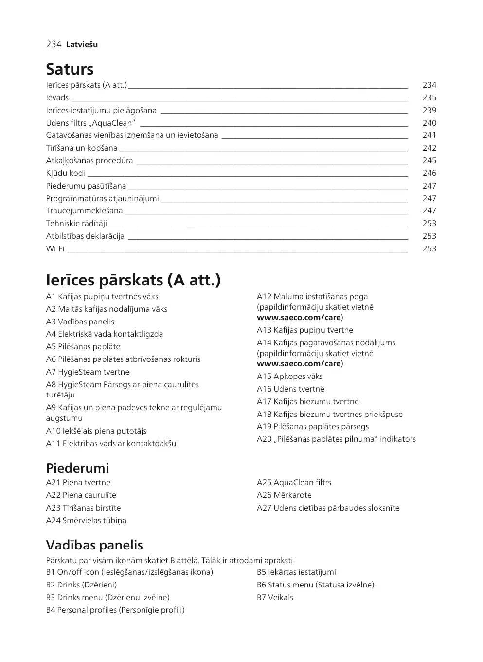 Ievads Apsveicam ar pilnīgi automātiskā „Saeco” kafijas automāta iegādi! Lai pilnībā izmantotu Saeco piedāvāto tiešsaistes atbalstu, varat izmantot vadības paneli, lai reģistrētu kafijas automātu, izmantojot iebūvēto Wi-Fi savienojumu, vai doties uz vietni www.saeco.com/MyCoffeeMachine un šeit reģistrēt savu izstrādājumu. Pirms izmantojat ierīci pirmo reizi, uzmanīgi izlasiet atsevišķo drošības brošūru un saglabājiet to, lai vajadzības gadījumā varētu ieskatīties tajā arī turpmāk. Jūsu pilnībā automātiskais kafijas automāts Saeco ļauj izveidot savienojumu ar Wi-Fi tīklu, lai uzlabotu kafijas baudīšanas pieredzi. Izveidojot kafijas automāta savienojumu ar Wi-Fi tīklu, jūs varēsiet: - iegūt regulārus programmatūras atjauninājumus, lai uzlabotu savu lietotāja pieredzi; - izmantot veikala funkciju, ja tā ir pieejama jūsu valstī; - ja tas ir pieejams jūsu valstī, varat sasaistīt kafijas automātu ar savu Amazon kontu piederumu papildināšanai; - izveidot savienojumu ar savu Alexa mājas ierīci, lai izmantotu balss vadību, ja tā ir pieejama jūsu valstī. Piezīme. Šī ierīce ir pārbaudīta ar kafiju. Arī rūpīgi iztīrītā ierīcē iespējamas kafijas paliekas. Tomēr mēs garantējam, ka ierīce ir pavisam jauna.