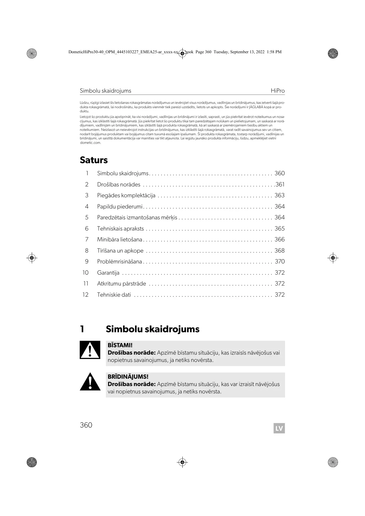 Lūdzu, rūpīgi izlasiet šīs lietošanas rokasgrāmatas norādījumus un ievērojiet visus norādījumus, vadlīnijas un brīdinājumus, kas ietverti šajā produkta rokasgrāmatā, lai nodrošinātu, ka produkts vienmēr tiek pareizi uzstādīts, lietots un apkopts. Šie norādījumi ir JĀGLABĀ kopā ar produktu. Lietojot šo produktu jūs apstiprināt, ka visi norādījumi, vadlīnijas un brīdinājumi ir izlasīti, saprasti, un jūs piekrītat ievērot noteikumus un nosacījumus, kas izklāstīti šajā rokasgrāmatā. Jūs piekrītat lietot šo produktu tikai tam paredzētajam nolūkam un pielietojumam, un saskaņā ar norādījumiem, vadlīnijām un brīdinājumiem, kas izklāstīti šajā produkta rokasgrāmatā, kā arī saskaņā ar piemērojamiem tiesību aktiem un noteikumiem. Neizlasot un neievērojot instrukcijas un brīdinājumus, kas izklāstīti šajā rokasgrāmatā, varat radīt savainojumus sev un citiem, nodarīt bojājumus produktam vai bojājumus citam tuvumā esošajam īpašumam. Šī produkta rokasgrāmata, tostarp norādījumi, vadlīnijas un brīdinājumi, un saistītā dokumentācija var mainīties vai tikt atjaunota. Lai iegūtu jaunāko produkta informāciju, lūdzu, apmeklējiet vietni dometic.com.
