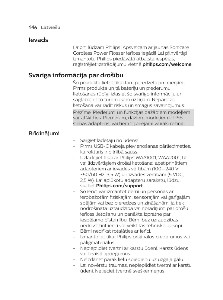 Sargiet lādētāju no ūdens! Pirms USB-C kabeļa pievienošanas pārliecinieties, ka rokturis ir pilnībā sauss. Uzlādējiet tikai ar Philips WAA1001, WAA2001, UL vai līdzvērtīgiem drošai lietošanai apstiprinātiem adapteriem ar ievades vērtībām (100—240 V; ~50/60 Hz; 3,5 W) un izvades vērtībām (5 VDC; 2,5 W). Lai aplūkotu adapteru sarakstu, lūdzu, skatiet Philips.com/support Šo ierīci var izmantot bērni un personas ar ierobežotām fiziskajām, sensorajām vai garīgajām spējām vai bez pieredzes un zināšanām, ja tiek nodrošināta uzraudzība vai norādījumi par drošu ierīces lietošanu un panākta izpratne par iespējamo bīstamību. Bērni bez uzraudzības nedrīkst tīrīt ierīci vai veikt tās tehnisko apkopi. Bērni nedrīkst rotaļāties ar ierīci. Izmantojiet tikai Philips oriģinālos piederumus vai palīgmateriālus. Nepiepildiet tvertni ar karstu ūdeni. Karsts ūdens var izraisīt apdegumus. Neizdariet pārāk lielu spiedienu uz uzgaļa galu. Lai novērstu traumas, nepiepildiet tvertni ar karstu ūdeni. Nelieciet tvertnē svešķermeņus.