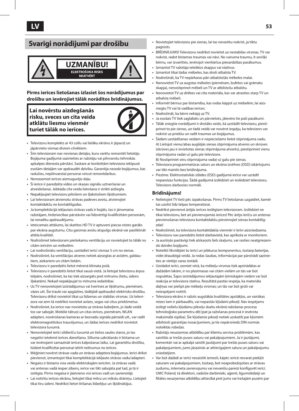 + Cette TV ne contient aucune pièce qui pourrait être réparée par l'utilisateur. En cas de défaut, contacter le fabricant ou l'agent autorisé qui assure le service après-vente. Le contact avec certaines parties stu- es à l'intérieur de la TV pourrait mettre votre vie en danger. La garantie ne couvre pas les défauts provoqués par des réparations effectuées par des tiers non autorisés.