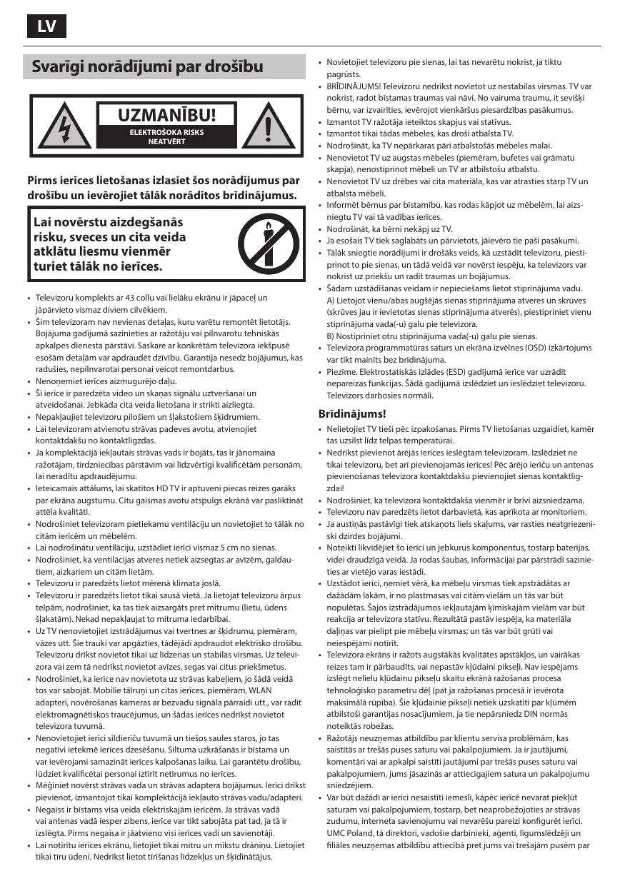 + Cette TV ne contient aucune pièce qui pourrait être réparée par l'utilisateur. En cas de défaut, contacter le fabricant ou l'agent autorisé qui assure le service après-vente. Le contact avec certaines parties situ- es à l'intérieur de la TV pourrait mettre votre vie en danger. La garantie ne couvre pas les défauts provoqués par des réparations effectuées par des tiers non autorisés.