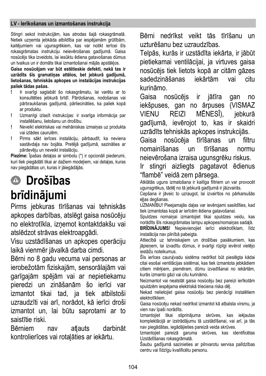 La pièce doit avoir une aération suffisante lorsque la hotte est utilisée conjointement avec d'autres appareils fonctionnant au gaz ou autres combustibles.