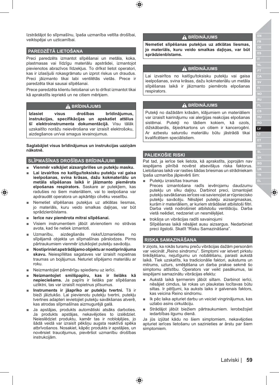 = Ne jetez pas les poussières provenant du ponçage dans un feu ouvert car les matériaux sous forme de fines particules peuvent être explosifs.