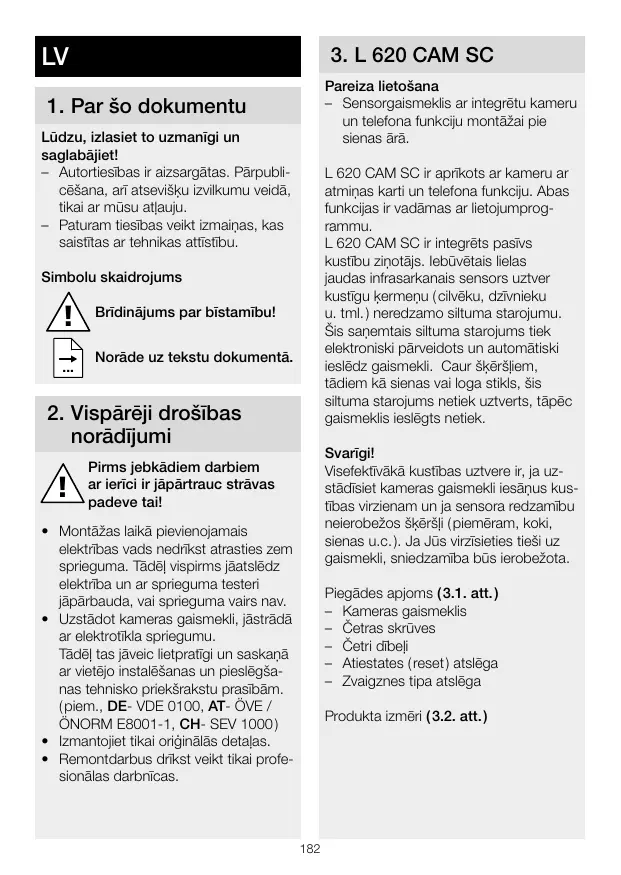Téléchargez la notice de votre Novērošanas kamera au format PDF gratuitement ! Retrouvez votre notice L620 - STEINEL et reprennez votre appareil électronique en main. Sur cette page sont publiés tous les documents nécessaires à l'utilisation de votre appareil L620 de la marque STEINEL.