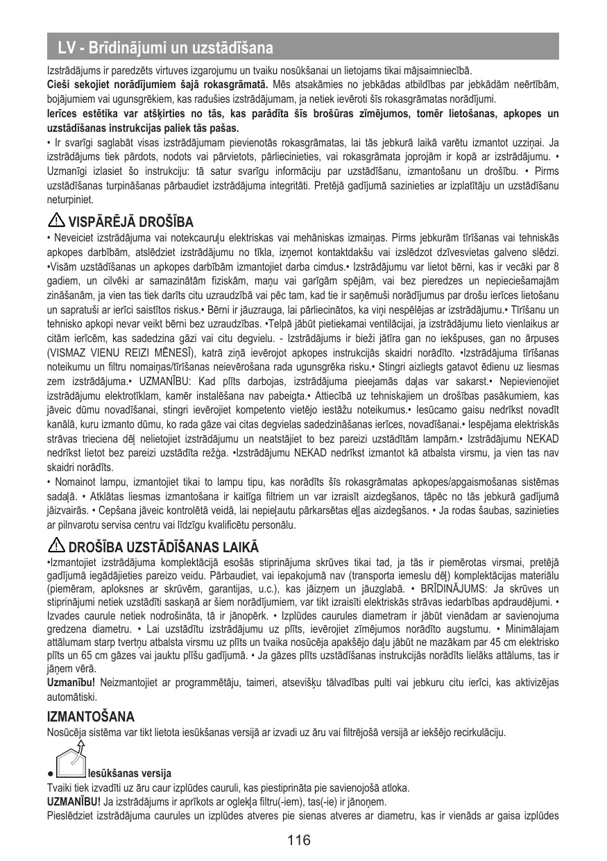 -Ne pas effectuer de variations électriques ou mécaniques sur le produit ou sur les conduits d'évacuation. +Avant toute opération de nettoyage où d'entretien, débrancher le produit du secteur électrique en enlevant la fiche ou à travers le disjoncteur général du logement. “Utiliser des gants de travail pour toutes les opérations d'installation et d'entretien.» Le produit peut être utlisé par des enfants âgés d'au moins 8 ans et par des personnes ayant des capacités physiques, sensorielles ou mentales réduites ou sans expérience ou sans les connaissances nécessaires, à condition qu'ils soient surveillés ou après que ces personnes aient reçu des instructions relatives à l'usage sûr de l'appareil et à la compréhension des dangers afférents.+ Les enfants doivent être contrôlés fn qu'ls ne jouent pas avec le produit Le nettoyage et l'entretien ne doivent pas être effectués par des enfants sans surveillance. Le local doit disposer d'une ventilation suffisante lorsque le produit est utlisé en même temps que d'autres appareils à combustion de gaz ou autres combustibles. Le produit doit être fréquemment nettoyé, à l'intérieur comme à l'extérieur (AU MOINS UNE FOIS PAR MOIS) ; respecter dans tous les cas les indications présentes dans les instructions d'entretien. Le non-respect des normes de nettoyage du produit et du remplacement/nettoyage des flres comporte des risques d'incendie. Il est