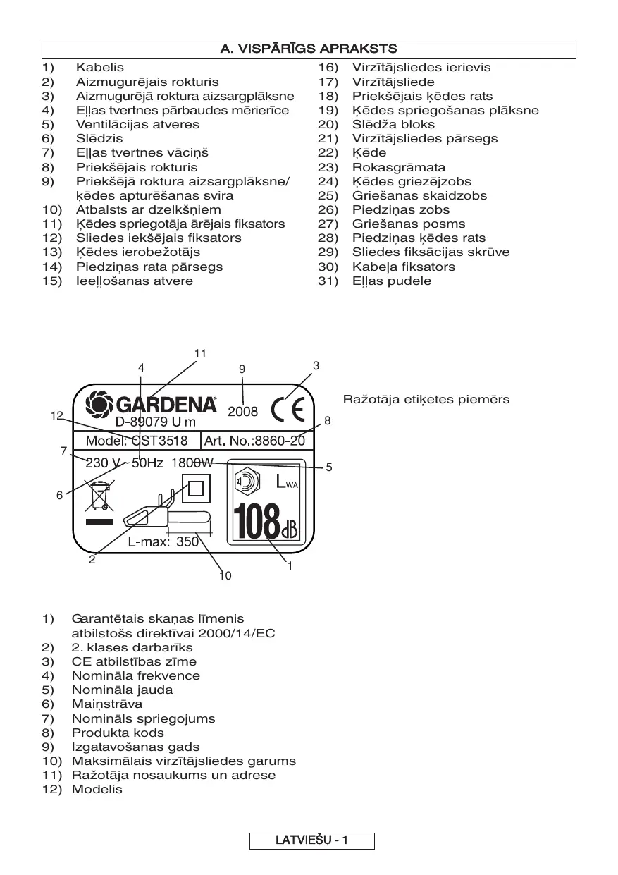 Téléchargez la notice de votre ķēdes zāģis au format PDF gratuitement ! Retrouvez votre notice CST 3018 - CST 3518 - GARDENA et reprennez votre appareil électronique en main. Sur cette page sont publiés tous les documents nécessaires à l'utilisation de votre appareil CST 3018 - CST 3518 de la marque GARDENA.