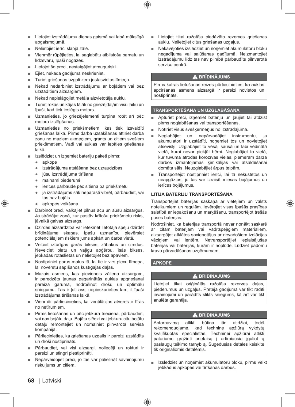 Débarrassez l'appareil de tous les corps étrangers. N'entreposez et ne transportez pas le produit équipé d'une batterie. Retirez-la et fixez-la séparément. Rangez-le dans un endroit frais, sec et correctement ventilé, hors de portée des enfants. Ne le rangez pas à proximité d'agents corrosifs tels que des produits chimiques de jardinage ou des sels de dégel. Ne le rangez pas à l'extérieur. = Pour le transport, attachez le produit pour l'empêcher de bouger ou de tomber, afin d'éviter toute blessure et tout dommage matériel.