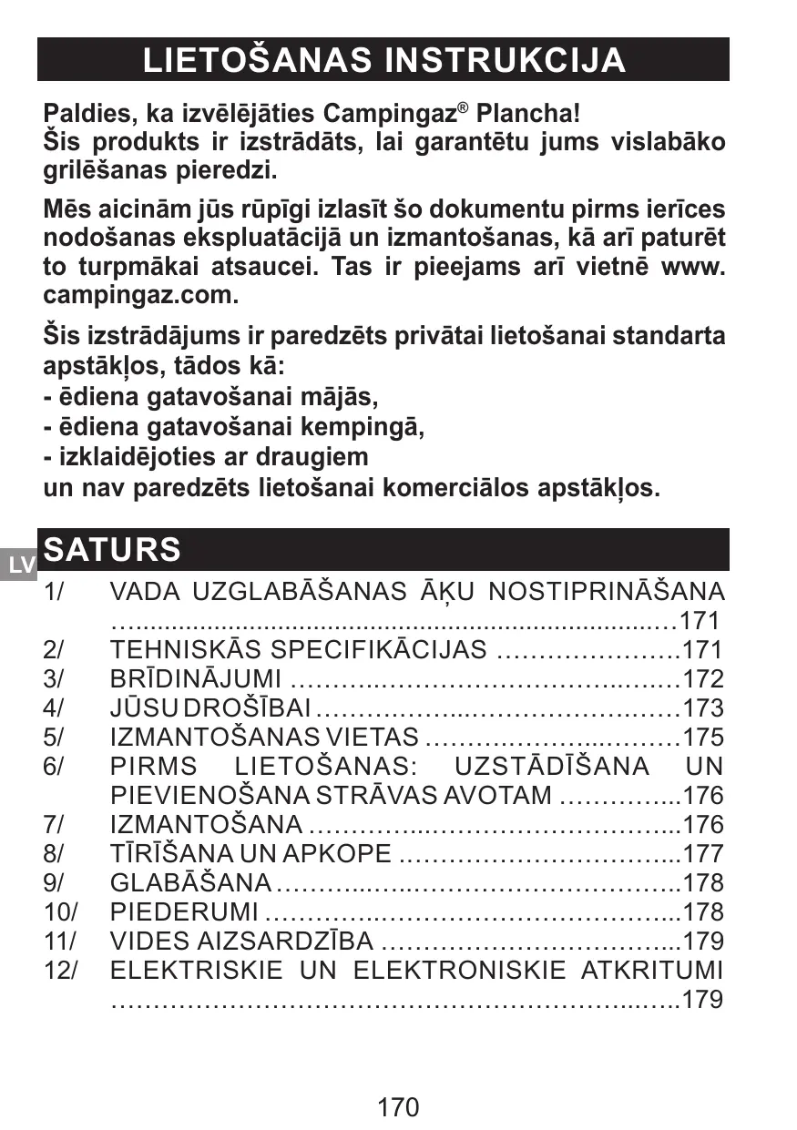 10/ ACCESSOIRES ADG (Campingaz®) recommande l’utilisation systématique de ses planchas avec des accessoires et pièces de rechange de la marque Campingaz®. ADG (Campingaz®) décline toute responsabilité en cas de dommages ou de mauvais fonctionnement survenant du fait de l’utilisation d'accessoires et/ou de pièces de rechange de marque différente.