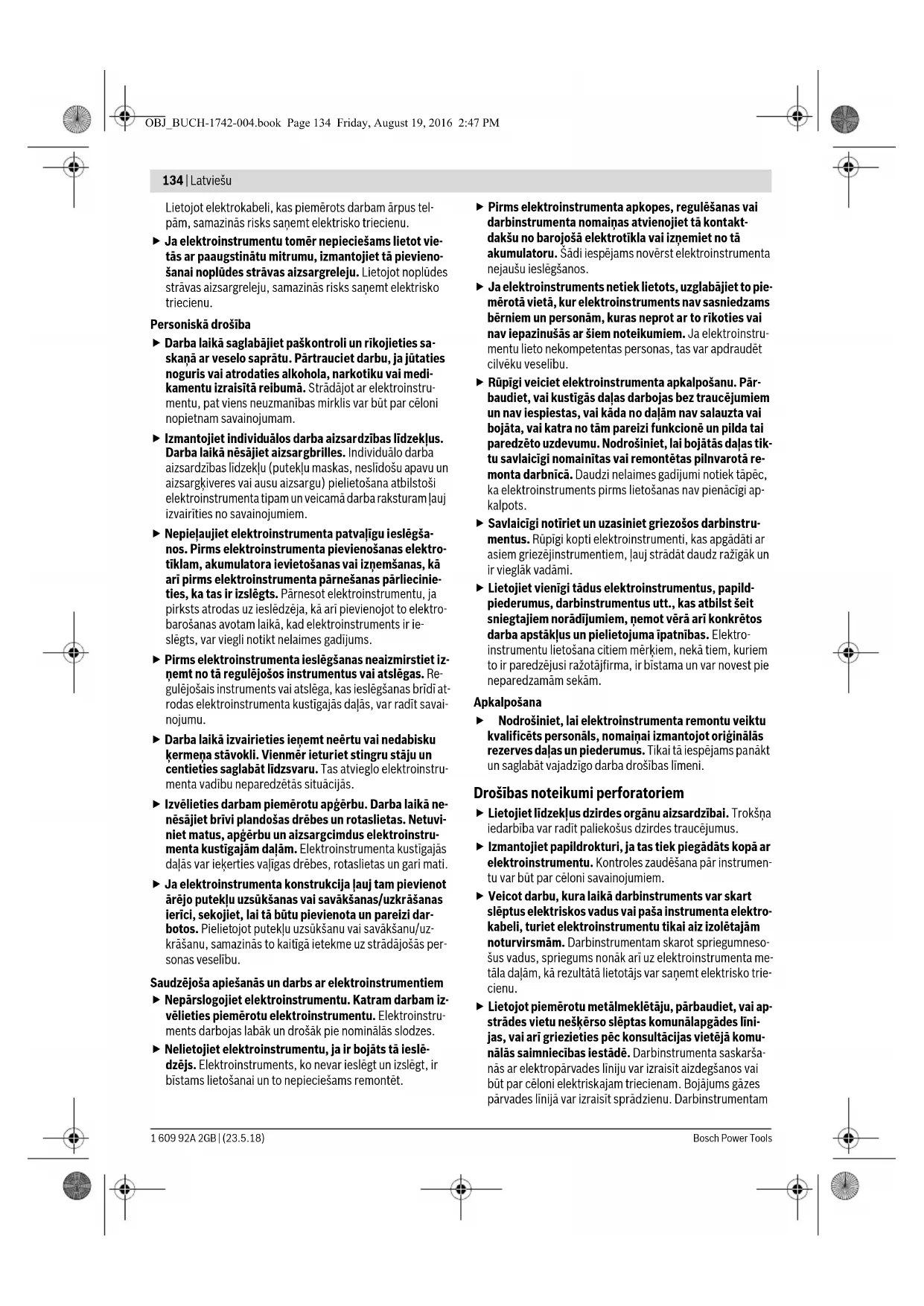 tu personu klātbūtne var novērst uzmanību, kā rezultātā jūs varat zaudēt kontroli pār elektroinstrumentu. Elektrodrošība Elektroinstrumenta kontaktdakšai jābūt piemērotai elektrotīkla kontaktligzdai. Kontaktdakšas konstrukci- ju nedrīkst nekādā veidā mainīt. Nelietojiet kontakt- dakšas salāgotājus, ja elektroinstruments caur kabeli tiek savienots ar aizsargzemējuma ķēdi. Neizmainītas konstrukcijas kontaktdakša, kas piemērota kontaktligzdai, ļauj samazināt elektriskā trieciena saņemšanas risku. Darba laikā nepieskarieties sazemētiem priekšme- tiem, piemēram, caurulēm, radiatoriem, plītīm vai le- dusskapjiem. Pieskaroties sazemētām virsmām, pieaug risks saņemt elektrisko triecienu. Nelietojiet elektroinstrumentu lietus laikā, neturiet to mitrumā. Mitrumam iekļūstot elektroinstrumentā, pieaug risks saņemt elektrisko triecienu. Nenesiet un nepiekariet elektroinstrumentu aiz elek- trokabeļa. Neraujiet aiz kabeļa, ja vēlaties atvienot ins- trumentu no elektrotīkla kontaktligzdas. Sargājiet elektrokabeli no karstuma, eļļas, asām šķautnēm un elektroinstrumenta kustīgajām daļām. Bojāts vai sa- mezglojies elektrokabelis var būt par cēloni elektriskajam triecienam. Darbinot elektroinstrumentu ārpus telpām, iz- mantojiet tā pievienošanai vienīgi tādus paga- rinātājkabeļus, kuru lietošana ārpus telpām ir atļauta. BRIDINAJUMS OBJ_BUCH-1742-004.book Page 133 Friday, August 19, 2016 2:47 PM134 | Latviešu 1 609 92A 2GB | (23.5.18) Bosch Power Tools Lietojot elektrokabeli, kas piemērots darbam ārpus tel- pām, samazinās risks saņemt elektrisko triecienu. Ja elektroinstrumentu tomēr nepieciešams lietot vie- tās ar paaugstinātu mitrumu, izmantojiet tā pievieno- šanai noplūdes strāvas aizsargreleju. Lietojot noplūdes strāvas aizsargreleju, samazinās risks saņemt elektrisko triecienu. Personiskā drošība Darba laikā saglabājiet paškontroli un rīkojieties sa- skaņā ar veselo saprātu. Pārtrauciet darbu, ja jūtaties noguris vai atrodaties alkohola, narkotiku vai medi- kamentu izraisītā reibumā. Strādājot ar elektroinstru- mentu, pat viens neuzmanības mirklis var būt par cēloni nopietnam savainojumam. Izmantojiet individuālos darba aizsardzības līdzekļus. Darba laikā nēsājiet aizsargbrilles. Individuālo darba aizsardzības līdzekļu (putekļu maskas, neslīdošu apavu un aizsargķiveres vai ausu aizsargu) pielietošana atbilstoši elektroinstrumenta tipam un veicamā darba raksturam ļauj izvairīties no savainojumiem. Nepieļaujiet elektroinstrumenta patvaļīgu ieslēgša- nos. Pirms elektroinstrumenta pievienošanas elektro- tīklam, akumulatora ievietošanas vai izņemšanas, kā arī pirms elektroinstrumenta pārnešanas pārliecinie- ties, ka tas ir izslēgts. Pārnesot elektroinstrumentu, ja pirksts atrodas uz ieslēdzēja, kā arī pievienojot to elektro- barošanas avotam laikā, kad elektroinstruments ir ie- slēgts, var viegli notikt nelaimes gadījums. Pirms elektroinstrumenta ieslēgšanas neaizmirstiet iz- ņemt no tā regulējošos instrumentus vai atslēgas. Re- gulējošais instruments vai atslēga, kas ieslēgšanas brīdī at- rodas elektroinstrumenta kustīgajās daļās, var radīt savai- nojumu. Darba laikā izvairieties ieņemt neērtu vai nedabisku ķermeņa stāvokli. Vienmēr ieturiet stingru stāju un centieties saglabāt līdzsvaru. Tas atvieglo elektroinstru- menta vadību neparedzētās situācijās. Izvēlieties darbam piemērotu apģērbu. Darba laikā ne- nēsājiet brīvi plandošas drēbes un rotaslietas. Netuvi- niet matus, apģērbu un aizsargcimdus elektroinstru- menta kustīgajām daļām. Elektroinstrumenta kustīgajās daļās var ieķerties vaļīgas drēbes, rotaslietas un gari mati. Ja elektroinstrumenta konstrukcija ļauj tam pievienot ārējo putekļu uzsūkšanas vai savākšanas/uzkrāšanas ierīci, sekojiet, lai tā būtu pievienota un pareizi dar- botos. Pielietojot putekļu uzsūkšanu vai savākšanu/uz- krāšanu, samazinās to kaitīgā ietekme uz strādājošās per- sonas veselību. Saudzējoša apiešanās un darbs ar elektroinstrumentiem Nepārslogojiet elektroinstrumentu. Katram darbam iz- vēlieties piemērotu elektroinstrumentu. Elektroinstru- ments darbojas labāk un drošāk pie nominālās slodzes. Nelietojiet elektroinstrumentu, ja ir bojāts tā ieslē- dzējs. Elektroinstruments, ko nevar ieslēgt un izslēgt, ir bīstams lietošanai un to nepieciešams remontēt. Pirms elektroinstrumenta apkopes, regulēšanas vai darbinstrumenta nomaiņas atvienojiet tā kontakt- dakšu no barojošā elektrotīkla vai izņemiet no tā akumulatoru. Šādi iespējams novērst elektroinstrumenta nejaušu ieslēgšanos. Ja elektroinstruments netiek lietots, uzglabājiet to pie- mērotā vietā, kur elektroinstruments nav sasniedzams bērniem un personām, kuras neprot ar to rīkoties vai nav iepazinušās ar šiem noteikumiem. Ja elektroinstru- mentu lieto nekompetentas personas, tas var apdraudēt cilvēku veselību. Rūpīgi veiciet elektroinstrumenta apkalpošanu. Pār- baudiet, vai kustīgās daļas darbojas bez traucējumiem un nav iespiestas, vai kāda no daļām nav salauzta vai bojāta, vai katra no tām pareizi funkcionē un pilda tai paredzēto uzdevumu. Nodrošiniet, lai bojātās daļas tik- tu savlaicīgi nomainītas vai remontētas pilnvarotā re- monta darbnīcā. Daudzi nelaimes gadījumi notiek tāpēc, ka elektroinstruments pirms lietošanas nav pienācīgi ap- kalpots. Savlaicīgi notīriet un uzasiniet griezošos darbinstru- mentus. Rūpīgi kopti elektroinstrumenti, kas apgādāti ar asiem griezējinstrumentiem, ļauj strādāt daudz ražīgāk un ir vieglāk vadāmi. Lietojiet vienīgi tādus elektroinstrumentus, papild- piederumus, darbinstrumentus utt., kas atbilst šeit sniegtajiem norādījumiem, ņemot vērā arī konkrētos darba apstākļus un pielietojuma īpatnības. Elektro- instrumentu lietošana citiem m