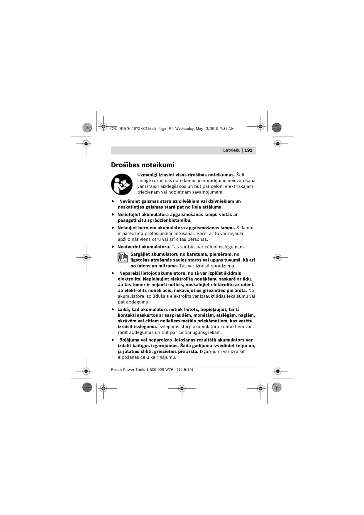 Drošības noteikumi Uzmanīgi izlasiet visus drošības noteikumus. Šeit sniegto drošības noteikumu un norādījumu neievērošana var izraisīt aizdegšanos un būt par cēloni elektriskajam triecienam vai nopietnam savainojumam. f Nevērsiet gaismas staru uz cilvēkiem vai dzīvniekiem un neskatieties gaismas starā pat no liela attāluma. f Nelietojiet akumulatora apgaismošanas lampu vietās ar paaugstinātu sprādzienbīstamību. f Neļaujiet bērniem akumulatora apgaismošanas lampu. Šī lampa ir paredzēta profesionālai lietošanai. Bērni ar to var nejauši apžilbināt viens otru vai arī citas personas. f Neatveriet akumulatoru. Tas var būt par cēloni īsslēgumam. Sargājiet akumulatoru no karstuma, piemēram, no ilgstošas atrašanās saules staros vai uguns tuvumā, kā arī no ūdens un mitruma. Tas var izraisīt sprādzienu. f Nepareizi lietojot akumulatoru, no tā var izplūst šķidrais elektrolīts. Nepieļaujiet elektrolīta nonākšanu saskarē ar ādu. Ja tas tomēr ir nejauši noticis, noskalojiet elektrolītu ar ūdeni. Ja elektrolīts nonāk acīs, nekavējoties griezieties pie ārsta. No akumulatora izplūdušais elektrolīts var izsaukt ādas iekaisumu vai pat apdegumu. f Laikā, kad akumulators netiek lietots, nepieļaujiet, lai tā kontakti saskartos ar saspraudēm, monētām, atslēgām, naglām, skrūvēm vai citiem nelieliem metāla priekšmetiem, kas varētu izraisīt īsslēgumu. Īsslēgums starp akumulatora kontaktiem var radīt apdegumus un būt par cēloni ugunsgrēkam. f Bojājuma vai nepareizas lietošanas rezultātā akumulators var izdalīt kaitīgus izgarojumus. Šādā gadījumā izvēdiniet telpu un, ja jūtaties slikti, griezieties pie ārsta. Izgarojumi var izraisīt elpošanas ceļu kairinājumu. OBJ_BUCH-1072-002.book Page 191 Wednesday, May 12, 2010 7:51 AM1 609 929 W76 | (12.5.10) Bosch Power Tools 192 | Latviešu f Akumulatora uzlādei lietojiet tikai tādu uzlādes ierīci, ko ir ieteikusi elektroinstrumenta ražotājfirma. Katra uzlādes ierīce ir paredzēta tikai noteikta tipa akumulatoram, un mēģinājums to lietot cita tipa akumulatoru uzlādei var novest pie uzlādes ierīces un/vai akumulatora aizdegšanās. f Lietojiet akumulatoru tikai kopā ar Bosch elektroinstrumentu. Tikai tā akumulators ir pasargāts no bīstamām pārslodzēm. f Lietojiet tikai oriģinālos Bosch akumulatorus, kuru spriegums atbilst uz elektroinstrumenta marķējuma plāksnītes norādītajai vērtībai. Lietojot citus akumulatorus, piemēram, pakaļdarinājumus un atjaunotus vai citās firmās ražotus akumulatorus, tie var eksplo- dēt, radot savainojumus un materiālo vērtību bojājumus. Funkciju apraksts Pielietojums Akumulatora apgaismošanas lampa ir paredzēta telpiski ierobežotu vietu un objektu apgaismošanai, lietojot to sausās vietās un turot rokā. Attēlotās sastāvdaļas Attēloto sastāvdaļu numerācija atbilst numuriem akumulatora apgaismošanas lampas attēlā, kas parādīts ilustratīvajā lappusē. 1 Apgaismojošā galva 2 Ieslēdzējs 3 Akumulators* 4 Fiksējošais taustiņš akumulatora izņemšanai 5 Turētājs stiprināšanai pie jostas *Šeit attēlotie vai aprakstītie piederumi neietilpst standarta piegādes komplektā. Pilns pārskats par izstrādājuma piederumiem ir sniegts mūsu piederumu katalogā. OBJ_BUCH-1072-002.book Page 192 Wednesday, May 12, 2010 7:51 AMLatviešu | 193 Bosch Power Tools 1 609 929 W76 | (12.5.10) Tehniskie parametri Montāža Akumulatora uzlāde (papildpiederums) (attēls A) f Akumulatora uzlādei lietojiet tikai piederumu lappusē parādītās uzlādes ierīces. Vienīgi šīs uzlādes ierīces ir piemērotas akumulatora apgaismošanas lampā izmantojamā litija-jonu akumulatora uzlādei. Piezīme. Akumulators tiek piegādāts daļēji uzlādētā stāvoklī. Lai elektroinstruments spētu darboties ar pilnu jaudu, pirms pirmās lietošanas pilnīgi uzlādējiet akumulatoru, pievienojot to uzlādes ierīcei. Litija-jonu akumulatoru var uzlādēt jebkurā laikā, nebaidoties samazināt tā kalpošanas ilgumu. Akumulatoram nekaitē arī pārtraukums uzlādes procesā. Akumulatora apgaismošanas lampa GLI 10,8 V-LI Professional Izstrādājuma numurs 3 601 D37 U.. Nominālais spriegums V= 10,8 Apgaismošanas ilgums, apt. min. 450 Darba temperatūra °C –10 ... +40 Uzglabāšanas temperatūra °C –15 ... +50 Svars atbilstoši EPTA-Procedure 01/2003 kg 0,3 Lūdzam ņemt vērā izstrādājuma numuru, kas norādīts uz akumulatora apgais- mošanas lampas marķējuma plāksnītes. Atsevišķām apgaismošanas lampām tirdzniecības apzīmējums var mainīties. OBJ_BUCH-1072-002.book Page 193 Wednesday, May 12, 2010 7:51 AM1 609 929 W76 | (12.5.10) Bosch Power Tools 194 | Latviešu Litija-jonu akumulators ir apgādāts ar elementu elektroniskās aizsardzības „Electronic Cell Protection (ECP)“ ierīci, kas to pasargā no dziļās izlādes. Ja akumulators ir izlādējies, īpaša aizsargshēma automātiski izslēdz apgaismošanas lampu. Pēc akumulatora apgaismošanas lampas automātiskas izslēgšanās nemēģiniet to no jauna ieslēgt, nospiežot ieslēdzēju. Pretējā gadījumā akumulators var tikt bojāts. Lai izņemtu akumulatoru 3, nospiediet fiksējošo taustiņu 4 un izvelciet akumulatoru no apgaismošanas lampas virzienā uz aizmuguri. Nelietojiet pārāk lielu spēku. Akumulators ir apgādāts ar NTC sistēmas temperatūras kontroles ierīci, kas pieļauj uzlādi tikai temperatūras diapazonā no 0 °C līdz 45 °C. Šādi tiek nodrošināts liels akumulatora kalpošanas laiks. Ievērojiet norādījumus par atbrīvošanos no nolietotajiem izstrādājumiem. Lietošana Uzsākot lietošanu Akumulatora ievietošana f Lietojiet tikai oriģinālos Bosch litija-jonu akumulatorus ar spriegumu, kas norādīts akumulatora apgaismošanas lampas marķējuma plāksnītē. Citu akumulatoru lietošana var izraisīt aizdegšanos un būt par cēloni nopietnam savainojumam. Ievietojiet uzlādē
