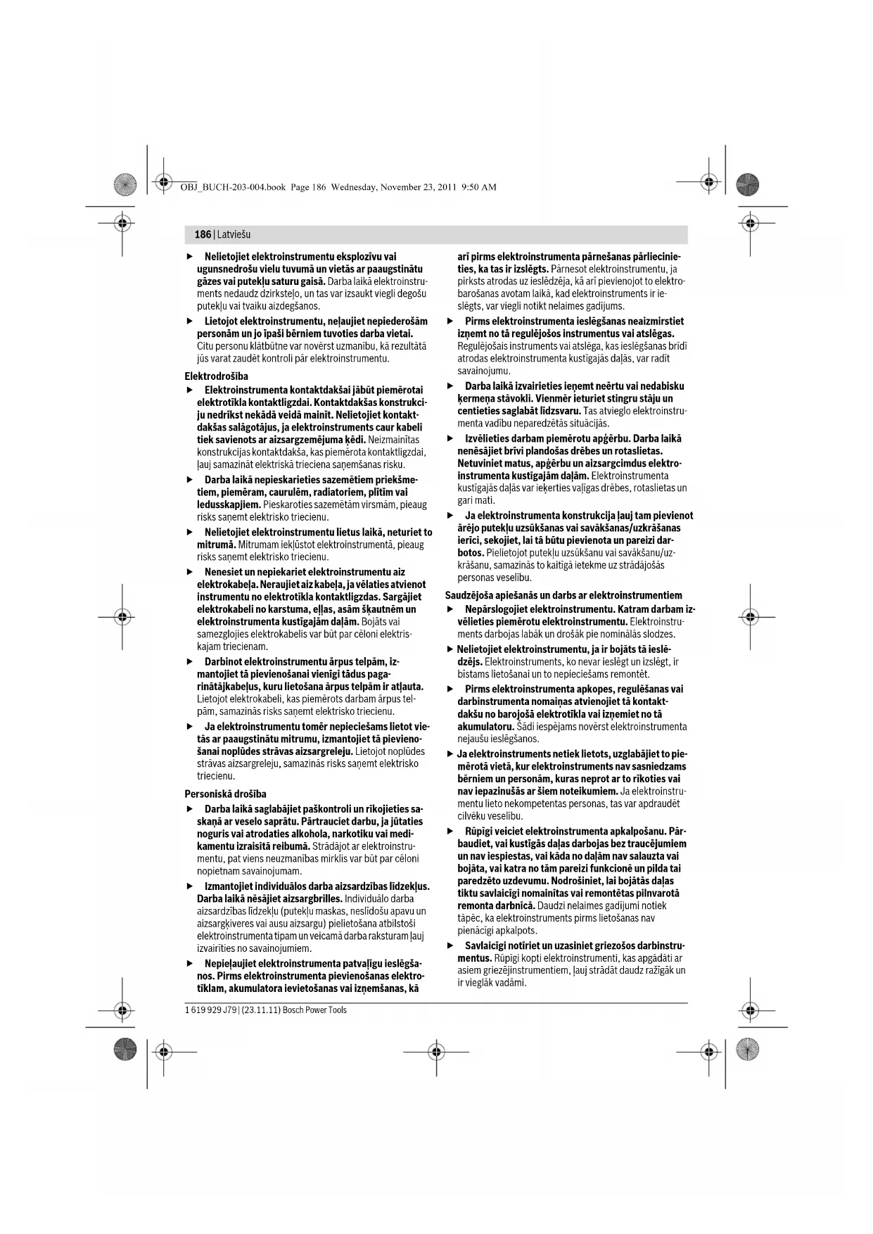 OBJ_BUCH-203-004.book Page 185 Wednesday, November 23, 2011 9:50 AM186 | Latviešu 1 619 929 J79 | (23.11.11) Bosch Power Tools f Nelietojiet elektroinstrumentu eksplozīvu vai ugunsnedrošu vielu tuvumā un vietās ar paaugstinātu gāzes vai putekļu saturu gaisā. Darba laikā elektroinstru- ments nedaudz dzirksteļo, un tas var izsaukt viegli degošu putekļu vai tvaiku aizdegšanos. f Lietojot elektroinstrumentu, neļaujiet nepiederošām personām un jo īpaši bērniem tuvoties darba vietai. Citu personu klātbūtne var novērst uzmanību, kā rezultātā jūs varat zaudēt kontroli pār elektroinstrumentu. Elektrodrošība f Elektroinstrumenta kontaktdakšai jābūt piemērotai elektrotīkla kontaktligzdai. Kontaktdakšas konstrukci- ju nedrīkst nekādā veidā mainīt. Nelietojiet kontakt- dakšas salāgotājus, ja elektroinstruments caur kabeli tiek savienots ar aizsargzemējuma ķēdi. Neizmainītas konstrukcijas kontaktdakša, kas piemērota kontaktligzdai, ļauj samazināt elektriskā trieciena saņemšanas risku. f Darba laikā nepieskarieties sazemētiem priekšme- tiem, piemēram, caurulēm, radiatoriem, plītīm vai ledusskapjiem. Pieskaroties sazemētām virsmām, pieaug risks saņemt elektrisko triecienu. f Nelietojiet elektroinstrumentu lietus laikā, neturiet to mitrumā. Mitrumam iekļūstot elektroinstrumentā, pieaug risks saņemt elektrisko triecienu. f Nenesiet un nepiekariet elektroinstrumentu aiz elektrokabeļa. Neraujiet aiz kabeļa, ja vēlaties atvienot instrumentu no elektrotīkla kontaktligzdas. Sargājiet elektrokabeli no karstuma, eļļas, asām šķautnēm un elektroinstrumenta kustīgajām daļām. Bojāts vai samezglojies elektrokabelis var būt par cēloni elektris- kajam triecienam. f Darbinot elektroinstrumentu ārpus telpām, iz- mantojiet tā pievienošanai vienīgi tādus paga- rinātājkabeļus, kuru lietošana ārpus telpām ir atļauta. Lietojot elektrokabeli, kas piemērots darbam ārpus tel- pām, samazinās risks saņemt elektrisko triecienu. f Ja elektroinstrumentu tomēr nepieciešams lietot vie- tās ar paaugstinātu mitrumu, izmantojiet tā pievieno- šanai noplūdes strāvas aizsargreleju. Lietojot noplūdes strāvas aizsargreleju, samazinās risks saņemt elektrisko triecienu. Personiskā drošība f Darba laikā saglabājiet paškontroli un rīkojieties sa- skaņā ar veselo saprātu. Pārtrauciet darbu, ja jūtaties noguris vai atrodaties alkohola, narkotiku vai medi- kamentu izraisītā reibumā. Strādājot ar elektroinstru- mentu, pat viens neuzmanības mirklis var būt par cēloni nopietnam savainojumam. f Izmantojiet individuālos darba aizsardzības līdzekļus. Darba laikā nēsājiet aizsargbrilles. Individuālo darba aizsardzības līdzekļu (putekļu maskas, neslīdošu apavu un aizsargķiveres vai ausu aizsargu) pielietošana atbilstoši elektroinstrumenta tipam un veicamā darba raksturam ļauj izvairīties no savainojumiem. f Nepieļaujiet elektroinstrumenta patvaļīgu ieslēgša- nos. Pirms elektroinstrumenta pievienošanas elektro- tīklam, akumulatora ievietošanas vai izņemšanas, kā arī pirms elektroinstrumenta pārnešanas pārliecinie- ties, ka tas ir izslēgts. Pārnesot elektroinstrumentu, ja pirksts atrodas uz ieslēdzēja, kā arī pievienojot to elektro- barošanas avotam laikā, kad elektroinstruments ir ie- slēgts, var viegli notikt nelaimes gadījums. f Pirms elektroinstrumenta ieslēgšanas neaizmirstiet izņemt no tā regulējošos instrumentus vai atslēgas. Regulējošais instruments vai atslēga, kas ieslēgšanas brīdī atrodas elektroinstrumenta kustīgajās daļās, var radīt savainojumu. f Darba laikā izvairieties ieņemt neērtu vai nedabisku ķermeņa stāvokli. Vienmēr ieturiet stingru stāju un centieties saglabāt līdzsvaru. Tas atvieglo elektroinstru- menta vadību neparedzētās situācijās. f Izvēlieties darbam piemērotu apģērbu. Darba laikā nenēsājiet brīvi plandošas drēbes un rotaslietas. Netuviniet matus, apģērbu un aizsargcimdus elektro- instrumenta kustīgajām daļām. Elektroinstrumenta kustīgajās daļās var ieķerties vaļīgas drēbes, rotaslietas un gari mati. f Ja elektroinstrumenta konstrukcija ļauj tam pievienot ārējo putekļu uzsūkšanas vai savākšanas/uzkrāšanas ierīci, sekojiet, lai tā būtu pievienota un pareizi dar- botos. Pielietojot putekļu uzsūkšanu vai savākšanu/uz- krāšanu, samazinās to kaitīgā ietekme uz strādājošās personas veselību. Saudzējoša apiešanās un darbs ar elektroinstrumentiem f Nepārslogojiet elektroinstrumentu. Katram darbam iz- vēlieties piemērotu elektroinstrumentu. Elektroinstru- ments darbojas labāk un drošāk pie nominālās slodzes. f Nelietojiet elektroinstrumentu, ja ir bojāts tā ieslē- dzējs. Elektroinstruments, ko nevar ieslēgt un izslēgt, ir bīstams lietošanai un to nepieciešams remontēt. f Pirms elektroinstrumenta apkopes, regulēšanas vai darbinstrumenta nomaiņas atvienojiet tā kontakt- dakšu no barojošā elektrotīkla vai izņemiet no tā akumulatoru. Šādi iespējams novērst elektroinstrumenta nejaušu ieslēgšanos. f Ja elektroinstruments netiek lietots, uzglabājiet to pie- mērotā vietā, kur elektroinstruments nav sasniedzams bērniem un personām, kuras neprot ar to rīkoties vai nav iepazinušās ar šiem noteikumiem. Ja elektroinstru- mentu lieto nekompetentas personas, tas var apdraudēt cilvēku veselību. f Rūpīgi veiciet elektroinstrumenta apkalpošanu. Pār- baudiet, vai kustīgās daļas darbojas bez traucējumiem un nav iespiestas, vai kāda no daļām nav salauzta vai bojāta, vai katra no tām pareizi funkcionē un pilda tai paredzēto uzdevumu. Nodrošiniet, lai bojātās daļas tiktu savlaicīgi nomainītas vai remontētas pilnvarotā remonta darbnīcā. Daudzi nelaimes gadījumi notiek tāpēc, ka elektroinstruments pirms lietošanas nav pienācīgi apkalpots. f Savlaicīgi notīriet un uzasiniet griezošos darbinstru- mentus. Rūpīgi 