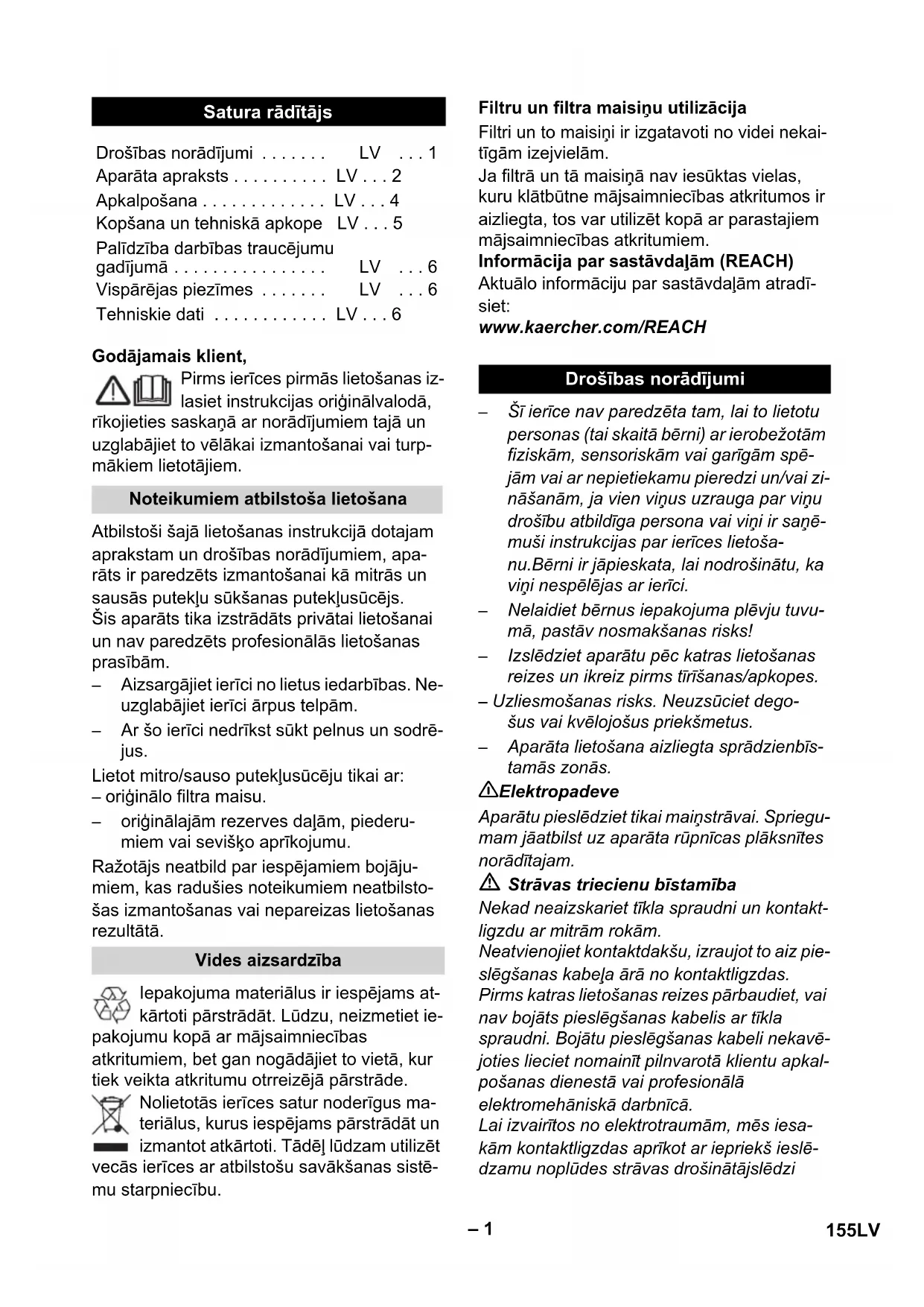 - mu starpniecību. Filtri un to maisiņi ir izgatavoti no videi nekai- tīgām izejvielām. Ja filtrā un tā maisiņā nav iesūktas vielas, kuru klātbūtne mājsaimniecības atkritumos ir aizliegta, tos var utilizēt kopā ar parastajiem mājsaimniecības atkritumiem. Informācija par sastāvdaļām (REACH) Aktuālo informāciju par sastāvdaļām atradī- siet: www.kaercher.com/REACH – Šī ierīce nav paredzēta tam, lai to lietotu personas (tai skaitā bērni) ar ierobežotām fiziskām, sensoriskām vai garīgām spē- jām vai ar nepietiekamu pieredzi un/vai zi- nāšanām, ja vien viņus uzrauga par viņu drošību atbildīga persona vai viņi ir saņē- muši instrukcijas par ierīces lietoša- nu.Bērni ir jāpieskata, lai nodrošinātu, ka viņi nespēlējas ar ierīci. – Nelaidiet bērnus iepakojuma plēvju tuvu- mā, pastāv nosmakšanas risks! – Izslēdziet aparātu pēc katras lietošanas reizes un ikreiz pirms tīrīšanas/apkopes. – Uzliesmošanas risks. Neuzsūciet dego- šus vai kvēlojošus priekšmetus. – Aparāta lietošana aizliegta sprādzienbīs- tamās zonās. 몇 Elektropadeve Aparātu pieslēdziet tikai maiņstrāvai. Spriegu- mam jāatbilst uz aparāta rūpnīcas plāksnītes norādītajam. Strāvas triecienu bīstamība Nekad neaizskariet tīkla spraudni un kontakt- ligzdu ar mitrām rokām. Neatvienojiet kontaktdakšu, izraujot to aiz pie- slēgšanas kabeļa ārā no kontaktligzdas. Pirms katras lietošanas reizes pārbaudiet, vai nav bojāts pieslēgšanas kabelis ar tīkla spraudni. Bojātu pieslēgšanas kabeli nekavē- joties lieciet nomainīt pilnvarotā klientu apkal- pošanas dienestā vai profesionālā elektromehāniskā darbnīcā. Lai izvairītos no elektrotraumām, mēs iesa- kām kontaktligzdas aprīkot ar iepriekš ieslē- dzamu noplūdes strāvas drošinātājslēdzi Satura rādītājs Drošības norādījumi