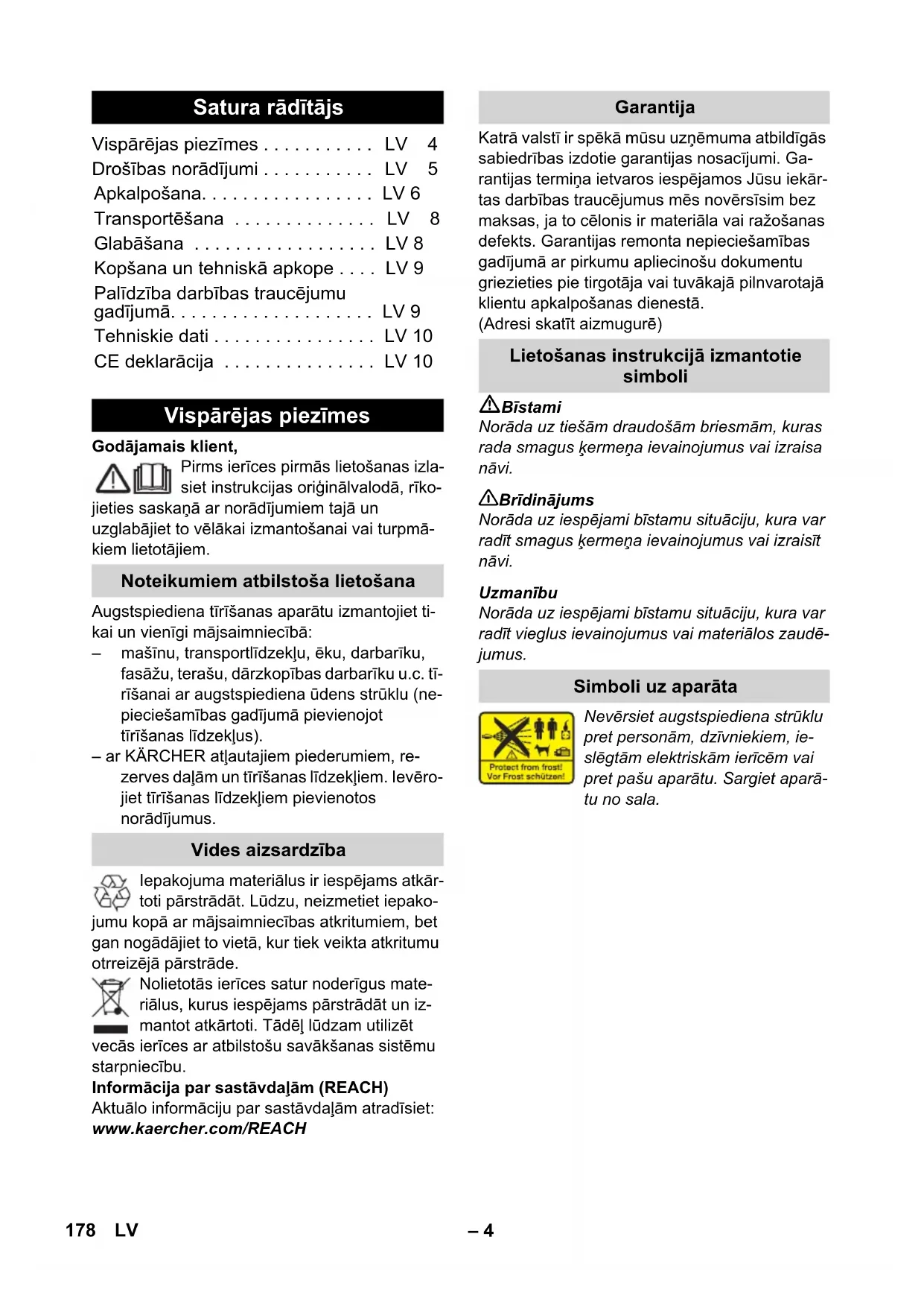 89 dB(A) EÜ vastavusdeklaratsioon Toode: Kõrgsurvepesur Tüüp: 1.674-xxx Asjakohased EÜ direktiivid: 2006/42/EU (+2009/127/EU) 2004/108/EÜ 2000/14/EÜ Kohaldatud ühtlustatud standardid: EN 55014–1: 2006 + A1: 2009 EN 55014–2: 1997 + A2: 2008 EN 60335–1 EN 60335–2–79 EN 61000–3–2: 2006 + A2: 2009 EN 61000–3–3: 2008 EN 62233: 2008 Järgitud vastavushindamise protseduur: 2000/14/EÜ: Lisa V Helivõimsuse tase dB(A) Mõõdetud: 86 Garanteeritud: 89 CEO Head of Approbation 177ET– 4 Godājamais klient, Pirms ierīces pirmās lietošanas izla- siet instrukcijas oriģinālvalodā, rīko- jieties saskaņā ar norādījumiem tajā un uzglabājiet to vēlākai izmantošanai vai turpmā- kiem lietotājiem. Augstspiediena tīrīšanas aparātu izmantojiet ti- kai un vienīgi mājsaimniecībā: – mašīnu, transportlīdzekļu, ēku, darbarīku, fasāžu, terašu, dārzkopības darbarīku u.c. tī- rīšanai ar augstspiediena ūdens strūklu (ne- pieciešamības gadījumā pievienojot tīrīšanas līdzekļus). – ar KÄRCHER atļautajiem piederumiem, re- zerves daļām un tīrīšanas līdzekļiem. Ievēro- jiet tīrīšanas līdzekļiem pievienotos norādījumus. Iepakojuma materiālus ir iespējams atkār- toti pārstrādāt. Lūdzu, neizmetiet iepako- jumu kopā ar mājsaimniecības atkritumiem, bet gan nogādājiet to vietā, kur tiek veikta atkritumu otrreizējā pārstrāde. Nolietotās ierīces satur noderīgus mate- riālus, kurus iespējams pārstrādāt un iz- mantot atkārtoti. Tādēļ lūdzam utilizēt vecās ierīces ar atbilstošu savākšanas sistēmu starpniecību. Informācija par sastāvdaļām (REACH) Aktuālo informāciju par sastāvdaļām atradīsiet: www.kaercher.com/REACH Katrā valstī ir spēkā mūsu uzņēmuma atbildīgās sabiedrības izdotie garantijas nosacījumi. Ga- rantijas termiņa ietvaros iespējamos Jūsu iekār- tas darbības traucējumus mēs novērsīsim bez maksas, ja to cēlonis ir materiāla vai ražošanas defekts. Garantijas remonta nepieciešamības gadījumā ar pirkumu apliecinošu dokumentu griezieties pie tirgotāja vai tuvākajā pilnvarotajā klientu apkalpošanas dienestā. (Adresi skatīt aizmugurē) Bīstami Norāda uz tiešām draudošām briesmām, kuras rada smagus ķermeņa ievainojumus vai izraisa nāvi. 몇 Brīdinājums Norāda uz iespējami bīstamu situāciju, kura var radīt smagus ķermeņa ievainojumus vai izraisīt nāvi. Uzmanību Norāda uz iespējami bīstamu situāciju, kura var radīt vieglus ievainojumus vai materiālos zaudē- jumus. Nevērsiet augstspiediena strūklu pret personām, dzīvniekiem, ie- slēgtām elektriskām ierīcēm vai pret pašu aparātu. Sargiet aparā- tu no sala. Satura rādītājs Vispārējas piezīmes . . . . . . . . . . . LV 4 Drošības norādījumi . . . . . . . . . . . LV 5 Apkalpošana. . . . . . . . . . . . . . . . . LV 6 Transportēšana . . . . . . . . . . . . . . LV 8 Glabāšana . . . . . . . . . . . . . . . . . . LV 8 Kopšana un tehniskā apkope . . . . LV 9 Palīdzība darbības traucējumu gadījumā. . . . . . . . . . . . . . . . . . . . LV 9 Tehniskie dati . . . . . . . . . . . . . . . . LV 10 CE deklarācija . . . . . . . . . . . . . . . LV 10 Vispārējas piezīmes Noteikumiem atbilstoša lietošana Vides aizsardzība Garantija Lietošanas instrukcijā izmantotie simboli Simboli uz aparāta 178 LV– 5 Bīstami Nekad neaizskariet tīkla spraudni un kon- taktligzdu ar mitrām rokām. Nelietojiet aparātu, ja ir bojāts tīkla pieslēgu- ma kabelis vai svarīgas aparāta daļas, pie- mēram, augstspiediena šļūtene, rokas smidzināšanas pistole vai drošības iekārtas. Pirms katras lietošanas reizes pārbaudiet, vai nav bojāts tīkla pieslēguma kabelis ar kontaktdakšu. Bojātu tīkla pieslēguma kabeli nekavējoties lieciet nomainīt pilnvarotā klientu apkalpošanas dienestā vai profesio- nālā elektromehāniskā darbnīcā. Pirms katras lietošanas reizes pārbaudiet, vai nav bojāta augstspiediena šļūtene. Ne- kavējoties nomainiet bojātu augstspiediena šļūteni. Aparāta lietošana aizliegta sprādzienbīsta- mās zonās. Strādājot ar aparātu paaugstinātas bīstamī- bas apstākļos (piemēram, degvielas uzpil- des stacijās), jāievēro atbilstošie drošības noteikumi. Nepareizi lietojot, augstspiediena strūkla var būt bīstama. Strūklu nedrīkst vērst uz cilvē- kiem, dzīvniekiem, zem sprieguma esošām elektriskām iekārtām un uz pašu aparātu. Augstspiediena strūklu nedrīkst vērst arī uz citiem cilvēkiem vai pats uz sevi, lai notīrītu apģērbu vai apavus. Neapsmidzināt priekšmetus, kas satur veselī- bu apdraudošas vielas (piemēram, azbestu). Augstspiediena strūkla var bojāt un pārsist transportlīdzekļu riepas/riepu ventiļus. Tā pirmā pazīme ir riepas krāsas maiņa. Bojā- tas transportlīdzekļa riepas/riepu ventiļi ir dzīvībai bīstami. Tīrot ievērojiet vismaz 30 cm lielu attālumu no smidzinātāja līdz objek- tam! Sprādzienbīstamība! Neizsmidziniet degošus šķidrumus. Nekādā gadījumā neiesūciet šķīdinātājus saturošus šķidrumus, neatšķaidītas skābes vai šķīdinātājus! Pie tiem pieskaitāmi, pie- mēram, benzīns, krāsu šķīdinātāji vai šķid- rais kurināmais. Izsmidzinātā migla ir ļoti ugunsnedroša, sprādzienbīstama un indīga. Neizmantojiet acetonu, neatšķaidītas skā- bes un šķīdinātājus, jo tie var bojāt aparātā izmantotos materiālus. 몇 Brīdinājums Pagarinātāja kabeļa kontaktdakšai un savie- nojumam jābūt ūdensdrošiem un tie nedrīkst atrasties ūdenī. Neatbilstošs pagarinātāja kabelis var būt dzīvībai bīstams. Tāpēc āra apstākļos iz- mantojiet tikai atļautus un atbilstoši marķētus pagarinātāja kabeļus ar pietiekošu vadu šķērsgriezumu: