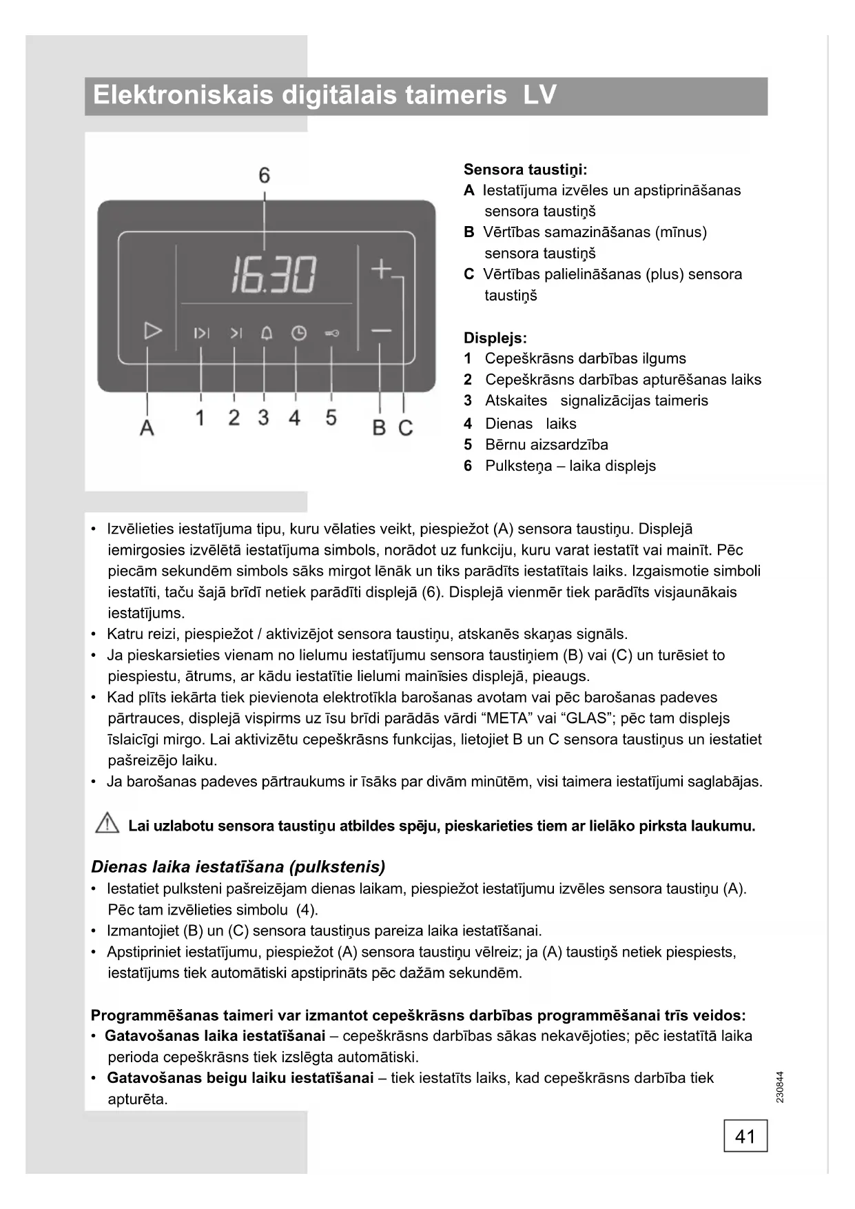 - Pec tam iestatiet gatavošanas beigu laiku: piespiediet (A) sensora taustiun un izvelieties simbulo (2) (displejā automatiski tiksparadīta pašreizējā dienas laika un iestatītā cepeskrāns darbības laika summa). Piespiediet (B) un (C) sensora taustinus un iestatiet gatavošanas beigu laiku.