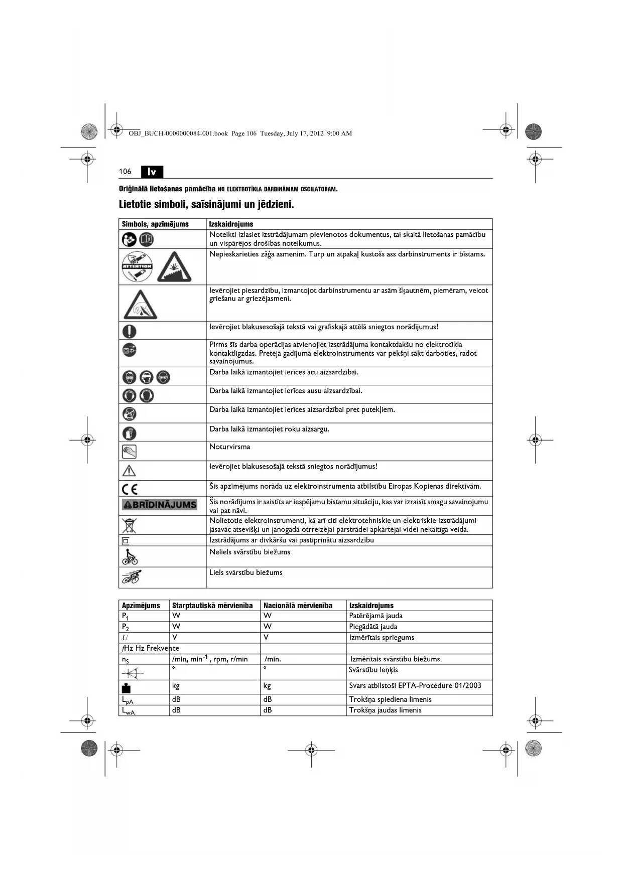 Sajā pamacibā noraditais vibrácijas limenis Ir Izmerits abilstosi standa EN 60745 noteiktajai procedurai un var tikt lietots elektroinstrumentu salidzhaanai. To var izmantot ari vibrácijas raditas papildu slodzes ieprieksejai novertesanai.