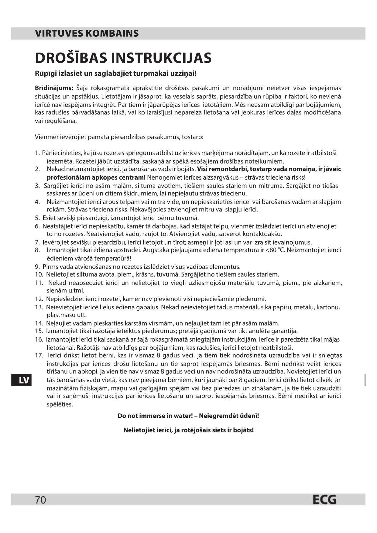 Ietinamais papīrs un kartons – nogādāt pārstrādes punktā. Iepakojuma folija, PE maisi, plastmasas daļas – iemest plastmasas šķirošanas konteineros. ATBRĪVOŠANĀS NO IERĪCĒM KALPOŠANAS LAIKA BEIGĀS Atbrīvošanās no elektriska un elektroniska aprīkojuma (attiecas uz ES dalībvalstīm un citām Eiropas valstīm, kur ieviesta pārstrādes sistēma) Norādītais simbols uz ierīces vai iepakojuma nozīmē, ka ierīci nedrīkst pievienot sadzīves atkritumiem. Nododiet ierīci norādītajā elektriska un elektroniska aprīkojuma pārstrādes punktā. Novērsiet negatīvu ietekmi uz veselību un vidi, parūpējoties par ierīces pareizu pārstrādi. Pārstrāde palīdz taupīt dabas resursus. Lai saņemtu plašāku informāciju par šīs ierīces pārstrādi, sazinieties ar vietējo atbildīgo iestādi, sadzīves atkritumu apstrādes organizāciju vai veikalu, kur ierīci iegādājāties. Šī ierīce atbilst ES direktīvu prasībām par elektromagnētisko saderību un elektrisko drošību. Pamācība ir pieejama vietnē www.ecg-electro.eu. Iespējamas teksta un tehnisko parametru izmaiņas. 08/05K