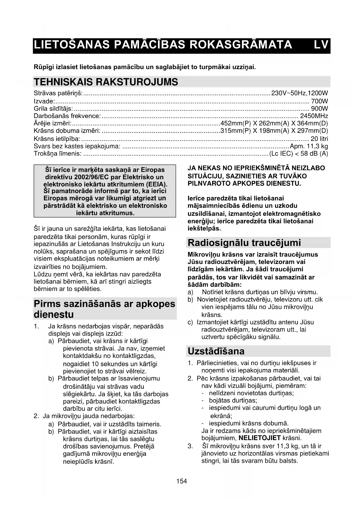 TEHNISKAIS RAKSTUROJUMS Strāvas patēriľš: 230V~50Hz,1200W Izvade: 700W Grila sildītājs: 900W Darbošanās frekvence: 2450MHz