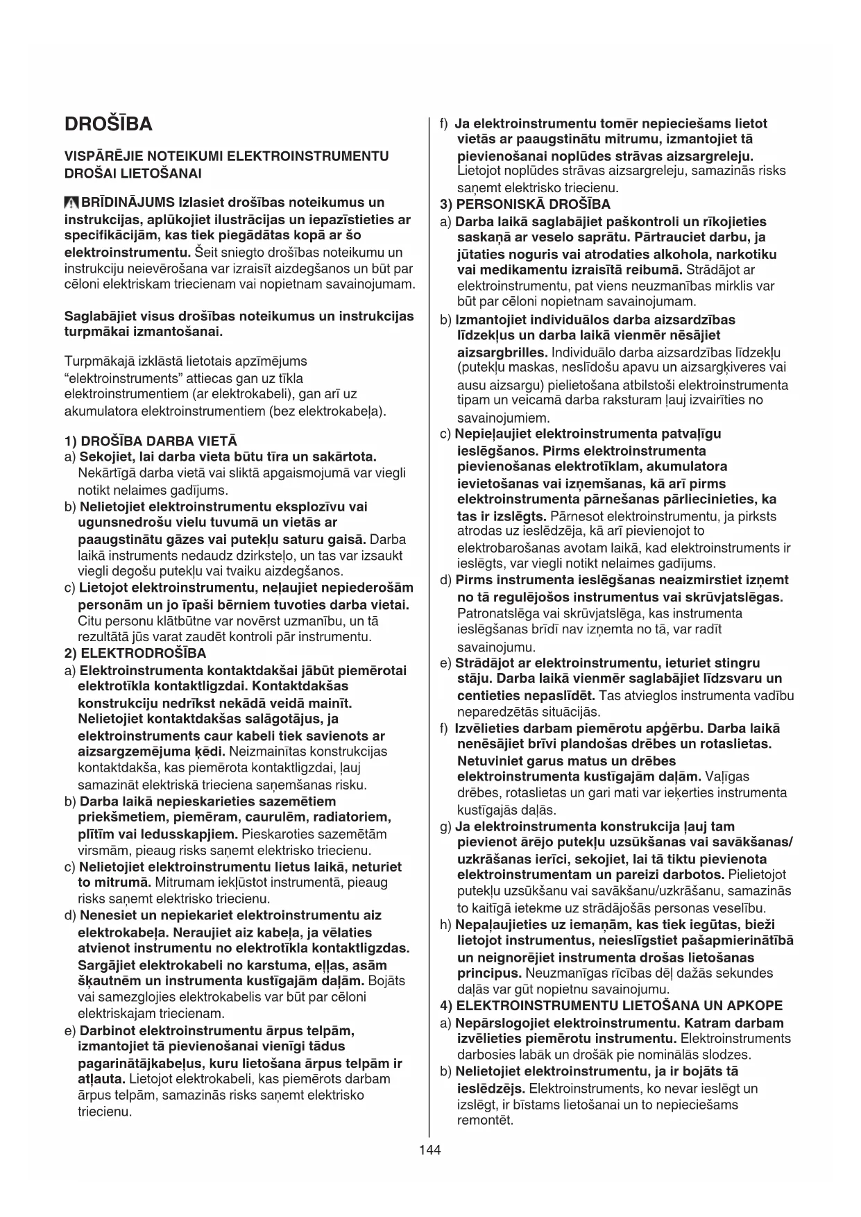 DROŠĪBA VISPĀRĒJIE NOTEIKUMI ELEKTROINSTRUMENTU DROŠAI LIETOŠANAI BRĪDINĀJUMS Izlasiet drošības noteikumus un