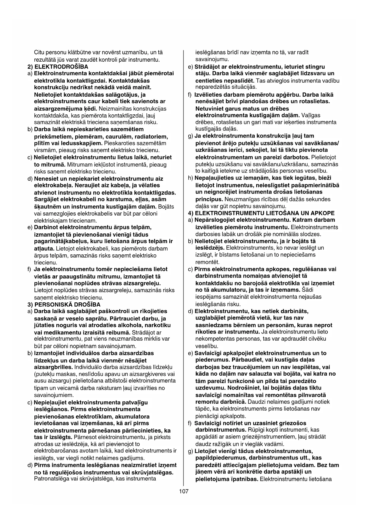 a) Nepārslogojiet elektroinstrumentu. Katram darbam izvēlieties piemērotu instrumentu. Elektroinstruments darbosies labāk un drošāk pie nominālās slodzes. b) Nelietojiet elektroinstrumentu, ja ir bojāts tā ieslēdzējs. Elektroinstruments, ko nevar ieslēgt un izslēgt, ir bīstams lietošanai un to nepieciešams remontēt. c) Pirms elektroinstrumenta apkopes, regulēšanas vai darbinstrumenta nomaiņas atvienojiet tā kontaktdakšu no barojošā elektrotīkla vai izņemiet no tā akumulatoru, ja tas ir izņemams. Šādi iespējams samazināt elektroinstrumenta nejaušas ieslēgšanās risku. d) Elektroinstrumentu, kas netiek darbināts, uzglabājiet piemērotā vietā, kur tas nav sasniedzams bērniem un personām, kuras neprot rīkoties ar instrumentu. Ja elektroinstrumentu lieto nekompetentas personas, tas var apdraudēt cilvēku veselību. e) Savlaicīgi apkalpojiet elektroinstrumentus un to piederumus. Pārbaudiet, vai kustīgās daļas darbojas bez traucējumiem un nav iespīlētas, vai kāda no daļām nav salauzta vai bojāta, vai katra no tām pareizi funkcionē un pilda tai paredzēto uzdevumu. Nodrošiniet, lai bojātās daļas tiktu savlaicīgi nomainītas vai remontētas pilnvarotā remontu darbnīcā. Daudzi nelaimes gadījumi notiek tāpēc, ka elektroinstruments pirms lietošanas nav pienācīgi apkalpots. f) Savlaicīgi notīriet un uzasiniet griezošos darbinstrumentus. Rūpīgi kopti instrumenti, kas apgādāti ar asiem griezējinstrumentiem, ļauj strādāt daudz ražīgāk un ir vieglāk vadāmi. g) Lietojiet vienīgi tādus elektroinstrumentus, papildpiederumus, darbinstrumentus utt., kas paredzēti attiecīgajam pielietojuma veidam. Bez tam jāņem vērā arī konkrētie darba apstākļi un pielietojuma īpatnības. Elektroinstrumentu lietošana108 citiem mērķiem, nekā to ir paredzējusi ražotājfirma, ir bīstama un var novest pie neparedzamām sekām. h) Uzturiet elektroinstrumenta rokturus un noturvirsmas sausas un tīras, sargājiet tās no eļļas un smērvielām. Slideni rokturi un noturvirsmas traucē efektīvi rīkoties ar elektroinstrumentu un to droši vadīt neparedzētās situācijās.