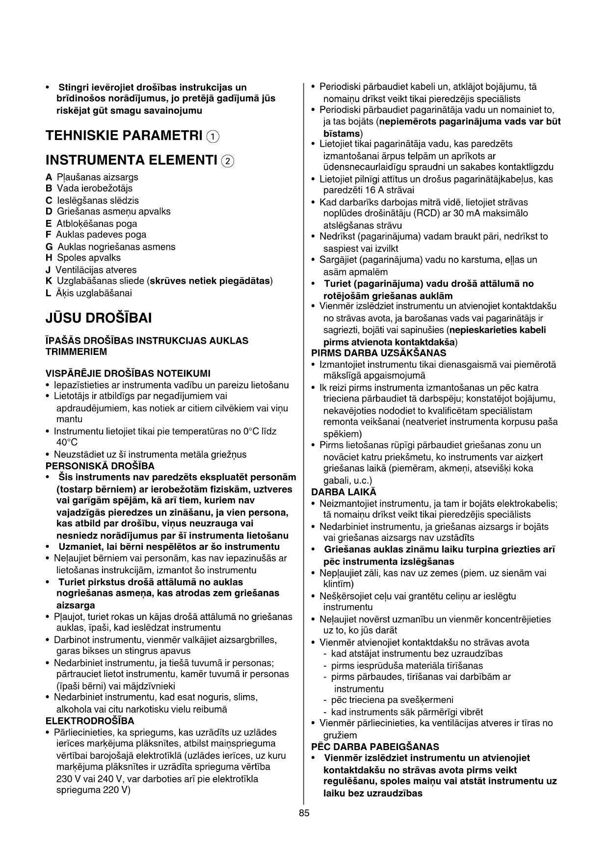 - Stingriievērojietdrošībasinstrukcijasun brīdinošosnorādījumus,jopretējāgadījumājūs riskējatgūtsmagusavainojumu TEHNISKIEPARAMETRI1 INSTRUMENTA ELEMENTI 2 A Pļaušanas aizsargs B Vada ierobežotājs C Ieslēgšanas slēdzis D Griešanas asmeņu apvalks E Atbloķēšanas poga F Auklas padeves poga G Auklas nogriešanas asmens H Spoles apvalks J Ventilācijas atveres K Uzglabāšanas sliede (skrūvesnetiekpiegādātas) L Āķis uzglabāšanai