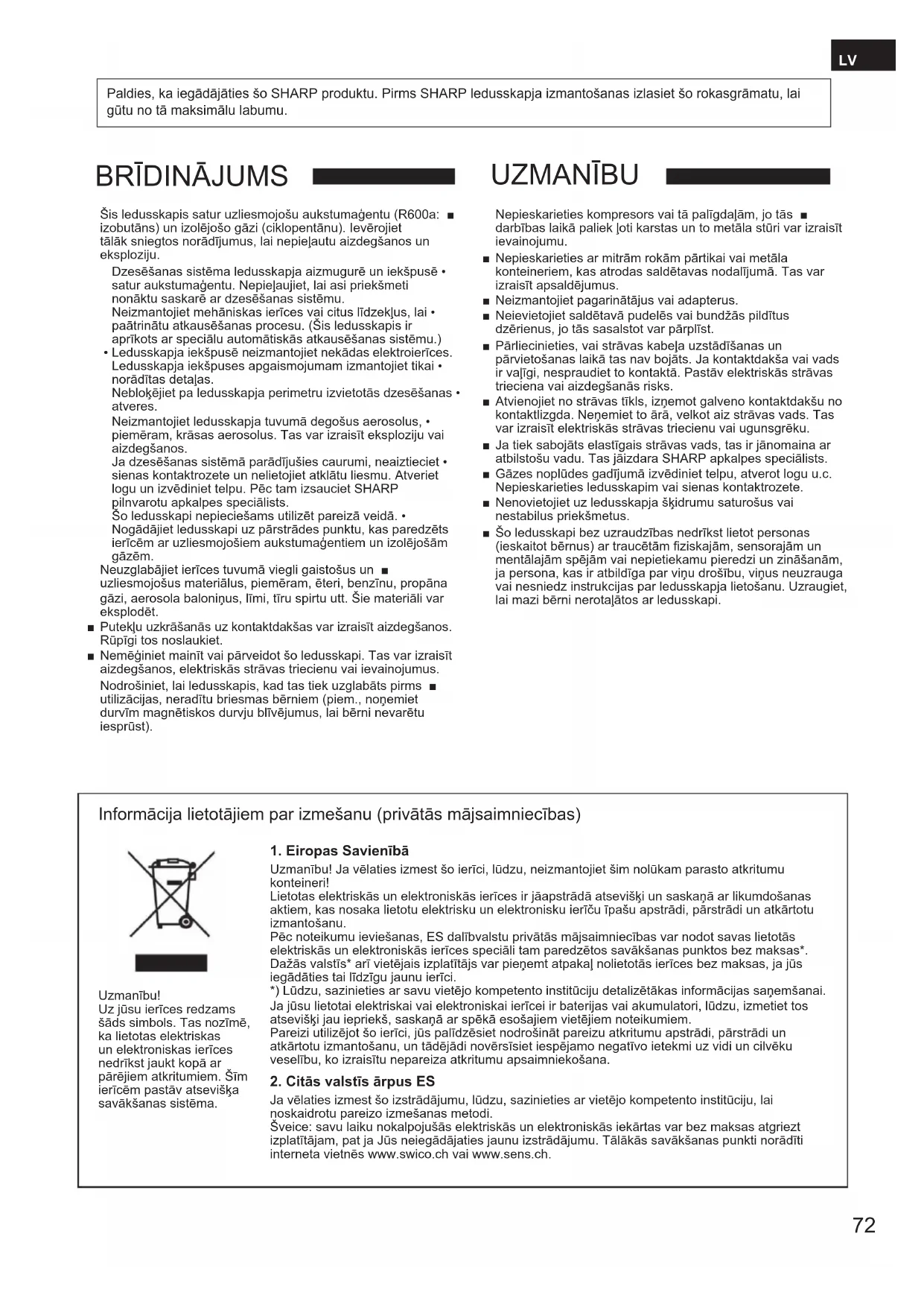 Ja dzesēšanas sistēmā parādījušies caurumi, neaiztieciet • sienas kontaktrozete un nelietojiet atklātu liesmu. Atveriet logu un izvēdiniet telpu. Pēc tam izsauciet SHARP pilnvarotu apkalpes speciālists.
