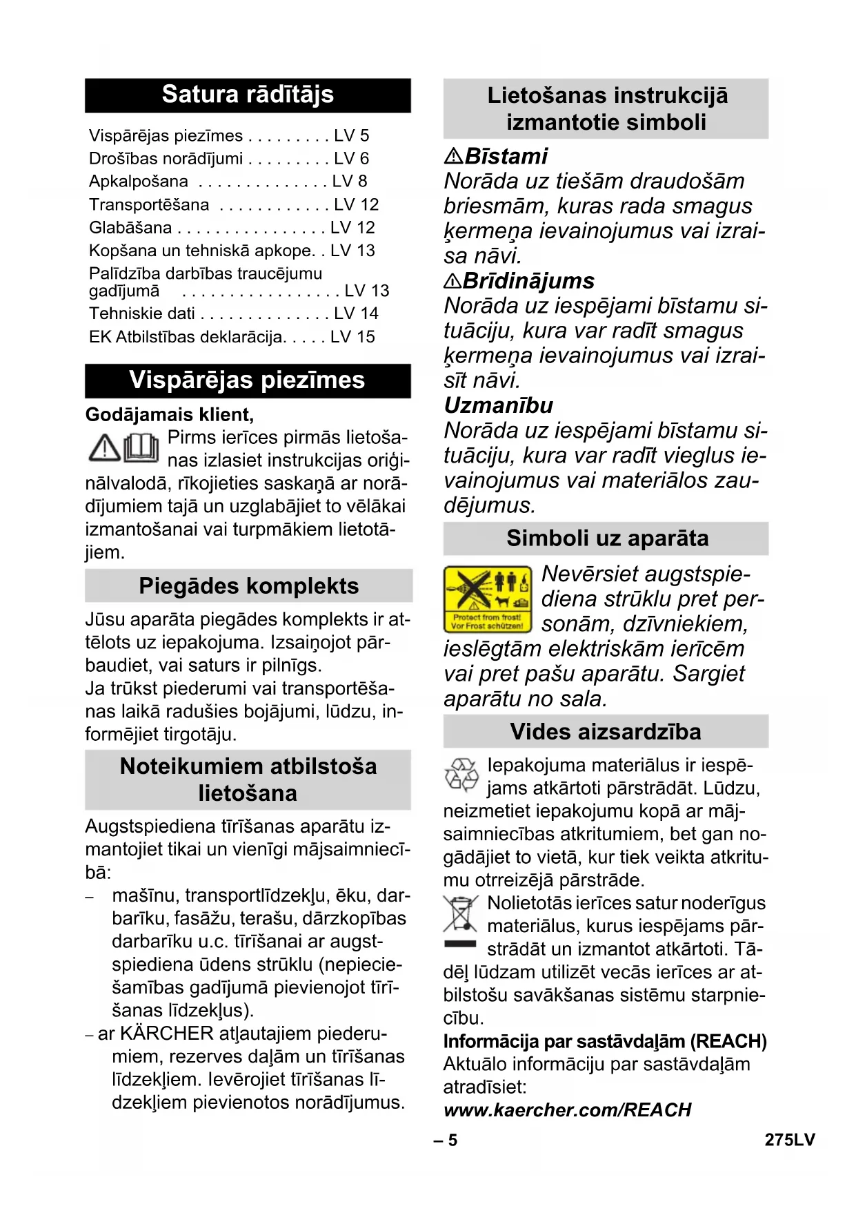 EN 61000–3–3: 2008 EN 62233: 2008 Järgitud vastavushindamise protseduur: 2000/14/EÜ: Lisa V Helivõimsuse tase dB(A) Mõõdetud: 87 Garanteeritud:90 Winnenden, 2013/07/01 CEO Head of Approbation 274 ET– 5 Godājamais klient, Pirms ierīces pirmās lietoša- nas izlasiet instrukcijas oriģi- nālvalodā, rīkojieties saskaņā ar norā- dījumiem tajā un uzglabājiet to vēlākai izmantošanai vai turpmākiem lietotā- jiem. Jūsu aparāta piegādes komplekts ir at- tēlots uz iepakojuma. Izsaiņojot pār- baudiet, vai saturs ir pilnīgs. Ja trūkst piederumi vai transportēša- nas laikā radušies bojājumi, lūdzu, in- formējiet tirgotāju. Augstspiediena tīrīšanas aparātu iz- mantojiet tikai un vienīgi mājsaimniecī- bā: – mašīnu, transportlīdzekļu, ēku, dar- barīku, fasāžu, terašu, dārzkopības darbarīku u.c. tīrīšanai ar augst- spiediena ūdens strūklu (nepiecie- šamības gadījumā pievienojot tīrī- šanas līdzekļus). – ar KÄRCHER atļautajiem piederu- miem, rezerves daļām un tīrīšanas līdzekļiem. Ievērojiet tīrīšanas lī- dzekļiem pievienotos norādījumus. Bīstami Norāda uz tiešām draudošām briesmām, kuras rada smagus ķermeņa ievainojumus vai izrai- sa nāvi. 몇 Brīdinājums Norāda uz iespējami bīstamu si- tuāciju, kura var radīt smagus ķermeņa ievainojumus vai izrai- sīt nāvi. Uzmanību Norāda uz iespējami bīstamu si- tuāciju, kura var radīt vieglus ie- vainojumus vai materiālos zau- dējumus. Nevērsiet augstspie- diena strūklu pret per- sonām, dzīvniekiem, ieslēgtām elektriskām ierīcēm vai pret pašu aparātu. Sargiet aparātu no sala. Iepakojuma materiālus ir iespē- jams atkārtoti pārstrādāt. Lūdzu, neizmetiet iepakojumu kopā ar māj- saimniecības atkritumiem, bet gan no- gādājiet to vietā, kur tiek veikta atkritu- mu otrreizējā pārstrāde. Nolietotās ierīces satur noderīgus materiālus, kurus iespējams pār- strādāt un izmantot atkārtoti. Tā- dēļ lūdzam utilizēt vecās ierīces ar at- bilstošu savākšanas sistēmu starpnie- cību. Informācija par sastāvdaļām (REACH) Aktuālo informāciju par sastāvdaļām atradīsiet: www.kaercher.com/REACH Satura rādītājs Vispārējas piezīmes . . . . . . . . . LV 5 Drošības norādījumi . . . . . . . . . LV 6 Apkalpošana . . . . . . . . . . . . . . LV 8 Transportēšana . . . . . . . . . . . . LV 12 Glabāšana . . . . . . . . . . . . . . . . LV 12 Kopšana un tehniskā apkope. . LV 13 Palīdzība darbības traucējumu gadījumā . . . . . . . . . . . . . . . . . LV 13 Tehniskie dati . . . . . . . . . . . . . . LV 14 EK Atbilstības deklarācija. . . . . LV 15 Vispārējas piezīmes Piegādes komplekts Noteikumiem atbilstoša lietošana Lietošanas instrukcijā izmantotie simboli Simboli uz aparāta Vides aizsardzība 275LV– 6 Katrā valstī ir spēkā mūsu uzņēmuma atbildīgās sabiedrības izdotie garanti- jas nosacījumi. Garantijas termiņa ie- tvaros iespējamos Jūsu iekārtas darbī- bas traucējumus mēs novērsīsim bez maksas, ja to cēlonis ir materiāla vai ražošanas defekts. Garantijas remonta nepieciešamības gadījumā ar pirkumu apliecinošu dokumentu griezieties pie tirgotāja vai tuvākajā pilnvarotajā klien- tu apkalpošanas dienestā. (Adresi skatīt aizmugurē) Bīstami Nekad neaizskariet tīkla spraudni un kontaktligzdu ar mitrām rokām. Nelietojiet aparātu, ja ir bojāts tīkla pieslēguma kabelis vai svarīgas aparāta daļas, pie- mēram, augstspiediena šļūte- ne, rokas smidzināšanas pis- tole vai drošības iekārtas. Pirms katras lietošanas rei- zes pārbaudiet, vai nav bojāts tīkla pieslēguma kabelis ar kontaktdakšu. Bojātu tīkla pieslēguma kabeli nekavējo- ties lieciet nomainīt pilnvarotā klientu apkalpošanas dienes- tā vai profesionālā elektrome- hāniskā darbnīcā. Pirms katras lietošanas rei- zes pārbaudiet, vai nav bojā- ta augstspiediena šļūtene. Nekavējoties nomainiet bojā- tu augstspiediena šļūteni. Aparāta lietošana aizliegta sprādzienbīstamās zonās. Strādājot ar aparātu paaug- stinātas bīstamības apstākļos (piemēram, degvielas uzpil- des stacijās), jāievēro atbils- tošie drošības noteikumi. Nepareizi lietojot, augstspie- diena strūkla var būt bīstama. Strūklu nedrīkst vērst uz cil- vēkiem, dzīvniekiem, zem sprieguma esošām elektris- kām iekārtām un uz pašu aparātu. Augstspiediena strūklu ne- drīkst vērst arī uz citiem cilvē- kiem vai pats uz sevi, lai notī- rītu apģērbu vai apavus. Neapsmidzināt priekšmetus, kas satur veselību apdraudo- šas vielas (piemēram, azbes- tu). Augstspiediena strūkla var bojāt un pārsist transportlī- dzekļu riepas/riepu ventiļus. Tā pirmā pazīme ir riepas krā- sas maiņa. Bojātas transport- līdzekļa riepas/riepu ventiļi ir dzīvībai bīstami. Tīrot ievēro- jiet vismaz 30 cm lielu attālu- mu no smidzinātāja līdz ob- jektam! Sprādzienbīstamība! Neizsmidziniet degošus šķid- rumus. Nekādā gadījumā neiesūciet šķīdinātājus saturošus šķid- rumus, neatšķaidītas skābes vai šķīdinātājus! Pie tiem pie- skaitāmi, piemēram, benzīns, krāsu šķīdinātāji vai šķidrais kurināmais. Izsmidzinātā migla ir ļoti ugunsnedroša, sprādzienbīstama un indīga. Garantija Drošības norādījumi 276 LV– 7 Neizmantojiet acetonu, neat- šķaidītas skābes un šķīdinā- tājus, jo tie var bojāt aparātā izmantotos materiālus. 몇 Brīdinājums Pagarinātāja vadam kontakt- dakšai un savienojumam jā- būt ūdensdrošiem un tie ne- drīkst atrasties ūdenī. Bez tam savienojums nedrīkst at- rasties uz grīdas. Ieteicams izmantot kabeļu uztīšanas spoles, kuras nodrošina, ka kontaktligzdas atrodas vis- maz 60 mm no grīdas. Neatbilstoši elektriskie paga- rināju kabeļi var būt bīstami dzīvībai. Tāpēc āra apstākļos izmantojiet tikai atļautus un atbilstoši marķētus elektris- kos pagarinātāju kabeļus